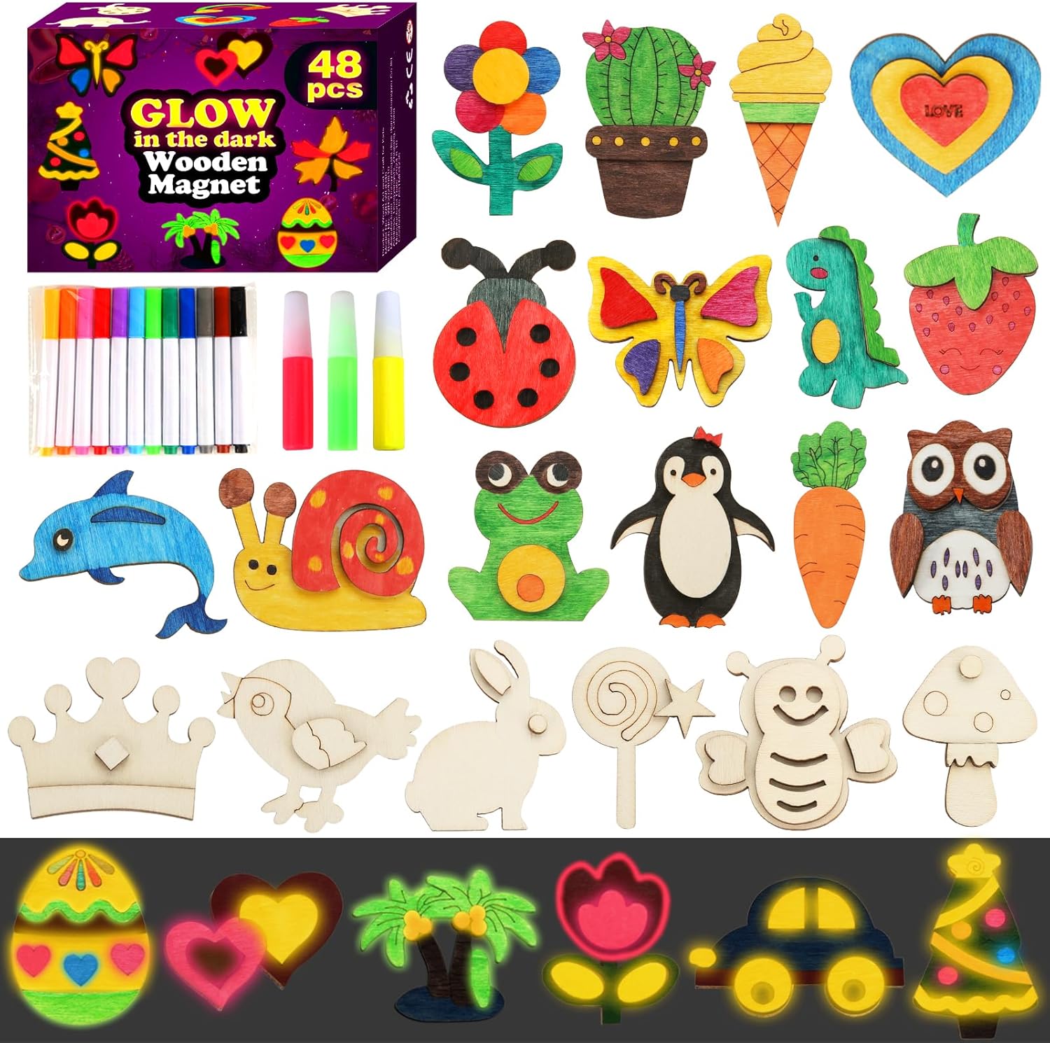 - DIY WOODEN MAGNETS: Includes 48 wooden crafts, 12 colored pens, 3 glow-in-the-dark paints, 48 strong magnet stickers. Wooden educational toy magnetic art to meet your child's creative needs. They are different designs such as animals, fruits, insects, four seasons, festive elements, variety of styles, perfect for all seasons