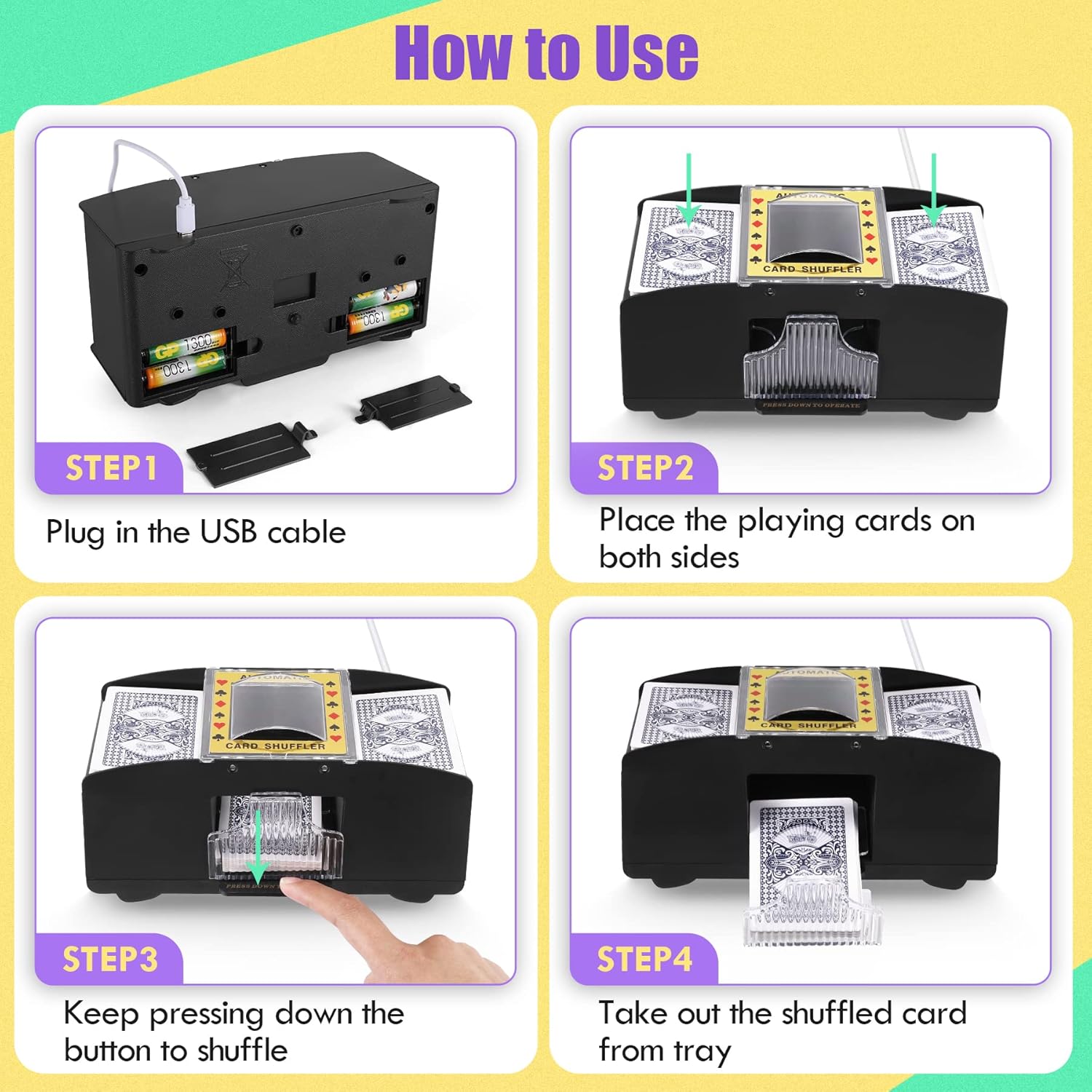 - USB & Battery Power Card Shuffler: Linbeba card shuffer has a USB-C interface: connect the card shuffler's power cord (Power Cord Included) to any USB port that can provide a 5V power supply, and you can start using it immediately. The shuffler also still includes the 4 AA battery power method ( Batteries Not Included ), so you can flexibly choose which method to use according to your needs