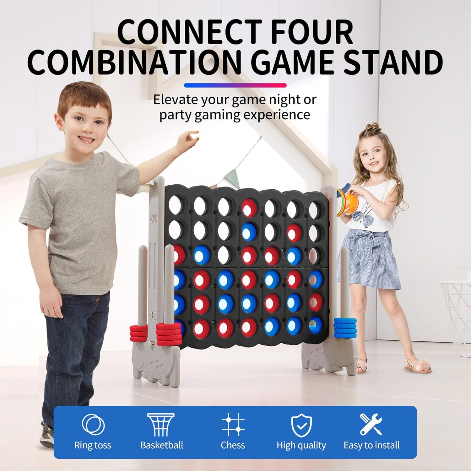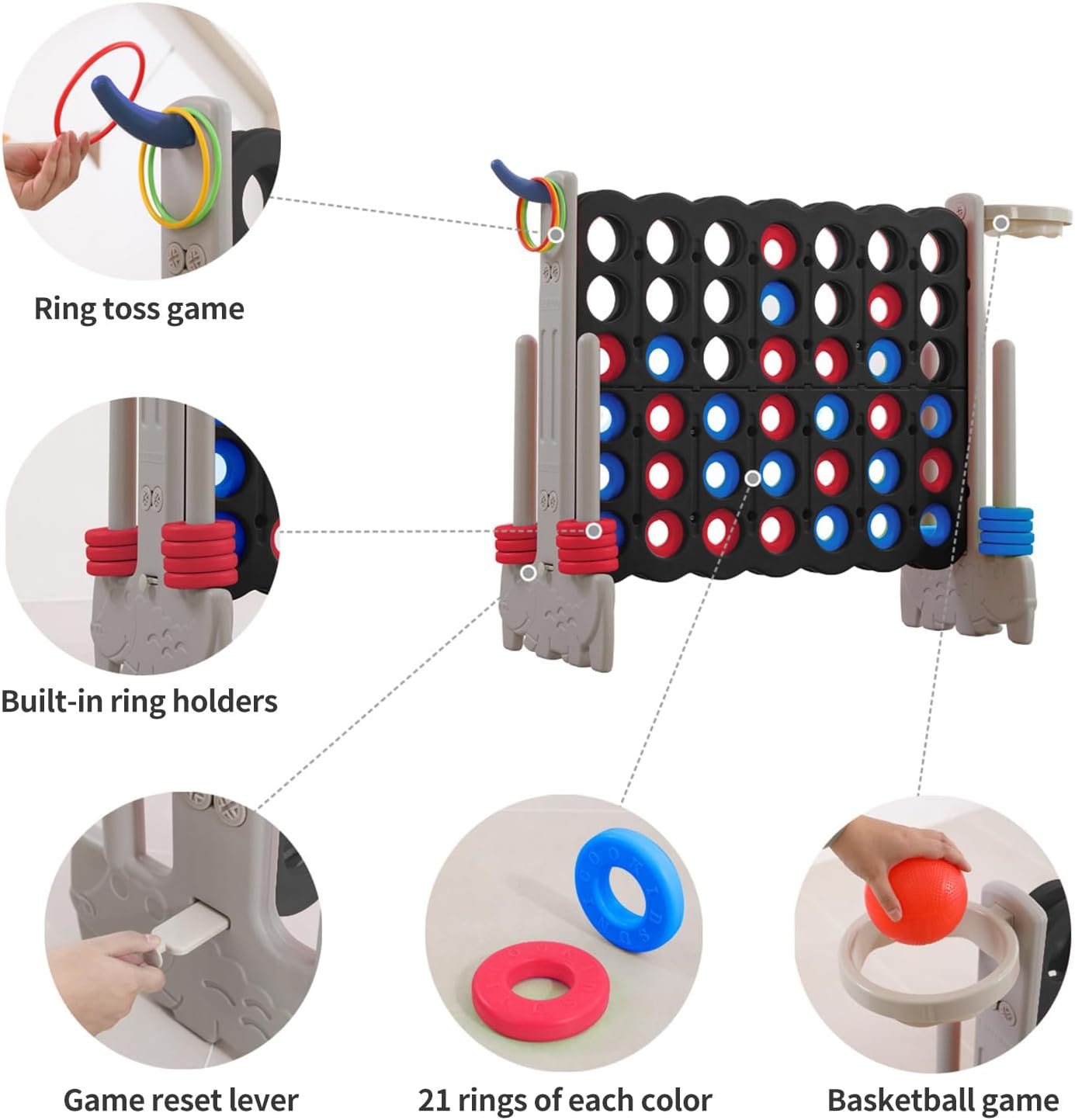 - Multifunctional Entertainment: Our 4 in a row game giant outdoor set is not just an outdoor connect game; it also features a built-in basketball hoop and ring toss. This versatile giant 4-to-Score game provides varied activities, enhancing the fun for all ages.