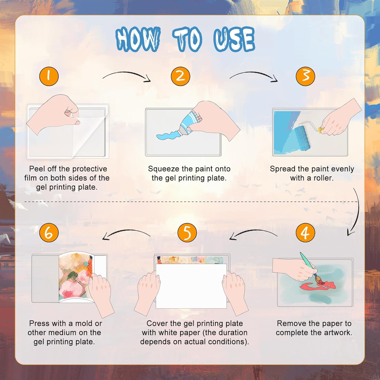 - METHOD OF APPLICATION - To use the gel printing plates, first spread paint on its surface and roll it out evenly. Then, Press the mold onto the gel printing plate to obtain the desired pattern, then cover it with a piece of white paper. After letting the paper sit for a bit (how long depends on the situation), peel off the paper to reveal your design.
