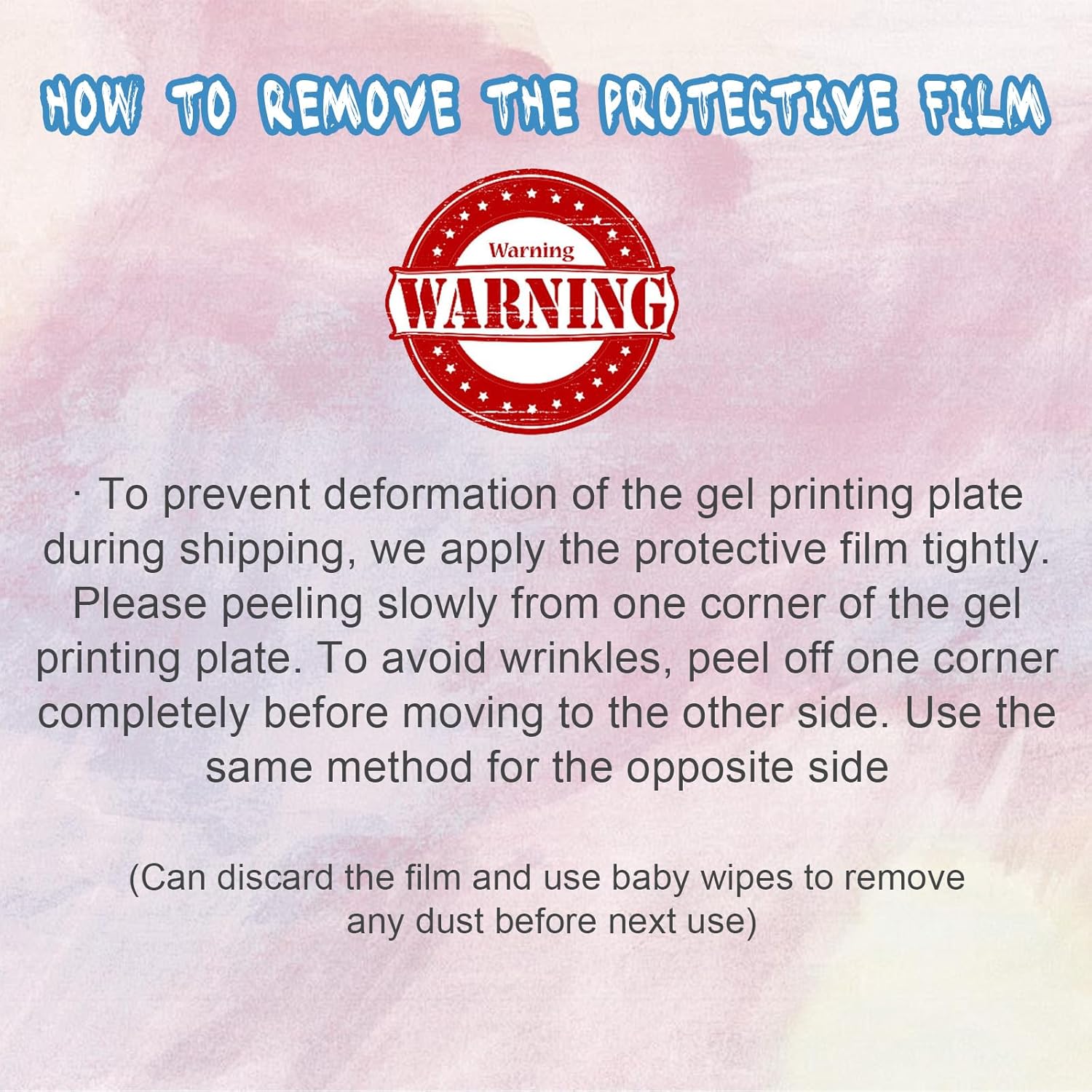 - EASY TO CLEAN & REUSABLE - Gel printing plates are easy to clean, as they can be washed with soap water or wiped with a damp cloth. After air-drying, apply the protective film and store them in their packaging box for next time use. However, to ensure a good experience for the future use, it's important to remove any remaining pigment residue from the gel printing plates surface after each use.
