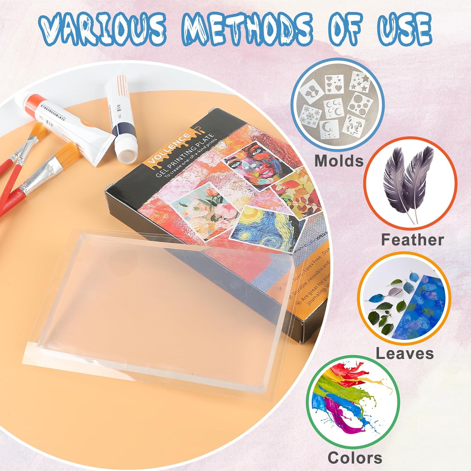 - IMAGINATION & CREATION - Creating arts on gel printing plate can igniting creativity and enhancing aesthetic prowess. Gel printing plate capable of accommodating a wide array of artistic needs, You can use different media, such as feathers, leaves etc. This versatility encourages individuals to boldly unleash their innovative and create expressive artwork. Furthermore, gel printing plate arts can be employed for home decor, scrapbooking, collage journaling, making cards etc.