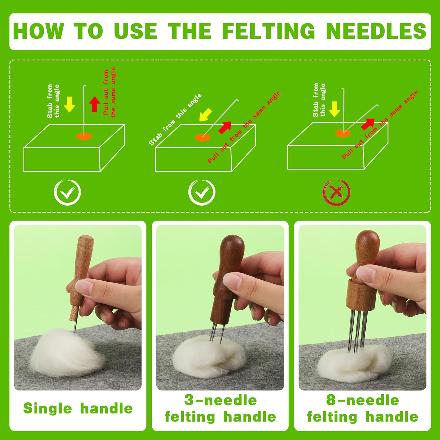 - Felting Needles: Our needle felting needles are made of unbreakable metal with an oiled surface to prevent rusting. You can combine 3 different types of wood handles and 4 different sizes of felting needles to make wool felts, 8-felt needle wood handles and 36 gauge are more suitable for felting large areas of wool, while single-felt needle wood handles and 42 gauge are more suitable for detailing.