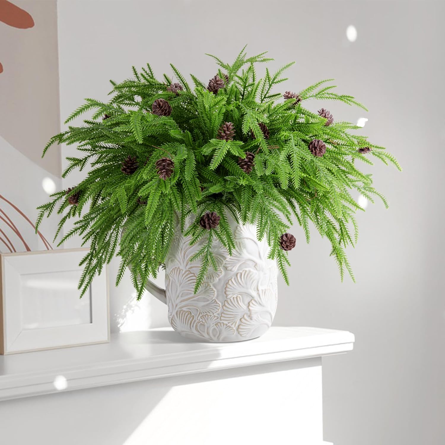 Watayo 10 Pcs Christmas Norfolk Pine Branches with Pine Cones, 19" Extra Length Fake Greenery Norfolk Pine Stems Sprigs, Artificial Xmas Branches Plants Pine Leaves for DIY Craft Garland Home Decor