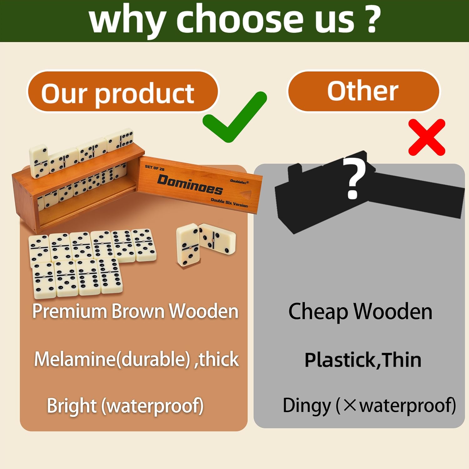 - 【MORE FUNNY GAMES】Double 6 dominoes set providing fun of hours for families, friends and kids. It can freely arranged different shapes and piled up. Whatever play Chicken Foot or Mexican Train games, that is really best choice!
