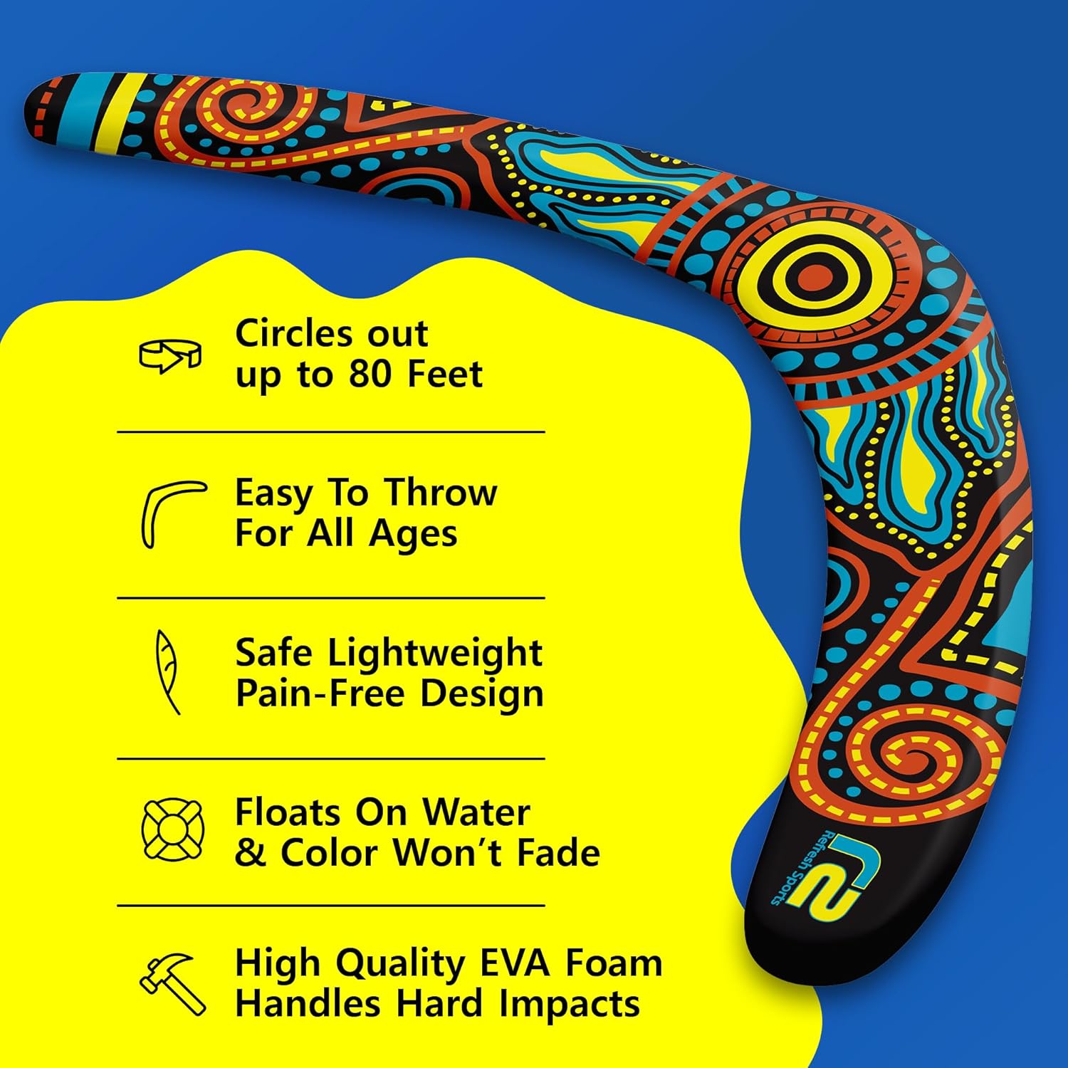 - ๐ก๐ฒ๐ & ๐จ๐ป๐ถ๐พ๐๐ฒ ๐๐ฉ๐ ๐๐ผ๐ฎ๐บ ๐๐ฒ๐๐ถ๐ด๐ป - The Boomerang is back! Our Boomerangs set the standard with a unique EVA (Ethylene-Vinyl Acetate Copolymer) Foam not seen elsewhere. Recognized for its durability in sports protection padding and gym tile flooring, this foam ensures strength against wear and tear, hard impacts, and water damage. This isn't just another traditional wooden Boomerang; it's made to easily fly back to you and not hurt your fingers when you catch it.