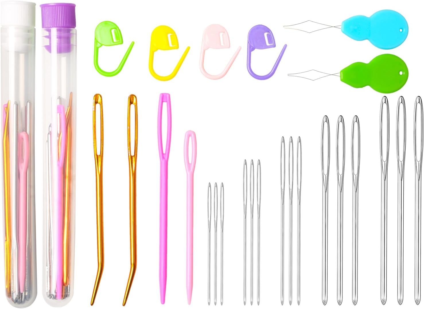 - Package Include - 30pcs large eye blunt needles, 4pcs bent yarn darning tapestry needle, 4pcs plastic sewing needle, 2 threaders & 5 sttitch markers, total 45pcs in two storage containers, differen kinds of sewing blunt needles to meet your daily needs and replacements. There are metal, plastic and bend ends for sewing, weaving in ends and darning any yarn project needed. The container makes it easier to keep track of your needles and will make finishing all of your projects a breeze.