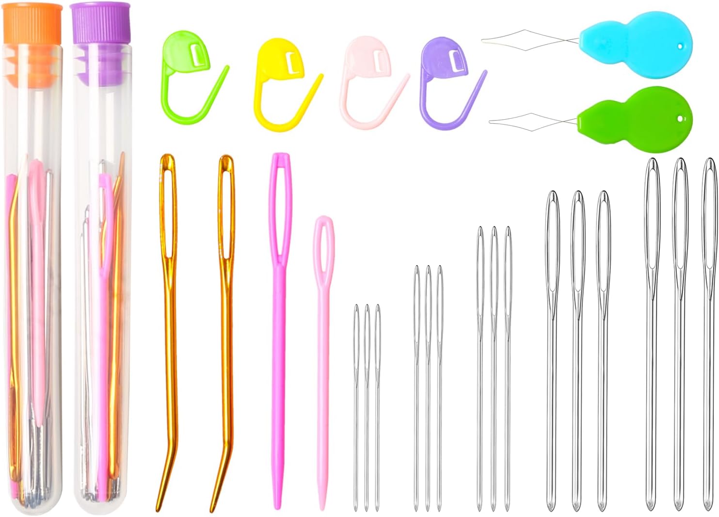 - Package Include - 30pcs large eye blunt needles, 4pcs bent yarn darning tapestry needle, 4pcs plastic sewing needle, 2 threaders & 5 sttitch markers, total 45pcs in two storage containers, differen kinds of sewing blunt needles to meet your daily needs and replacements. There are metal, plastic and bend ends for sewing, weaving in ends and darning any yarn project needed. The container makes it easier to keep track of your needles and will make finishing all of your projects a breeze.