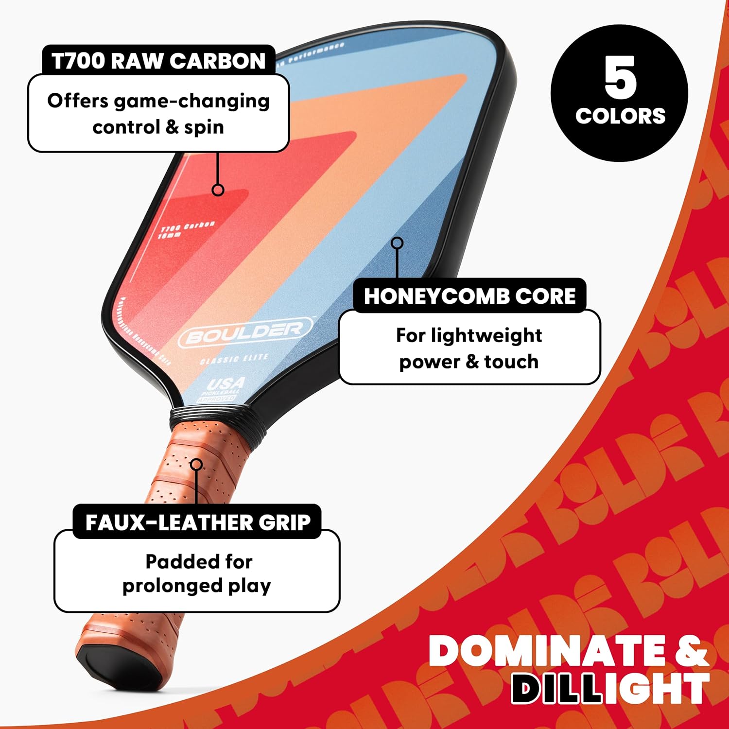 Boulder Carbon Fiber Pickleball Paddle | T700 Carbon Fiber | USAPA Approved, with Honeycomb Polymer Core | Pickleball Racket for Beginner & Experienced Players