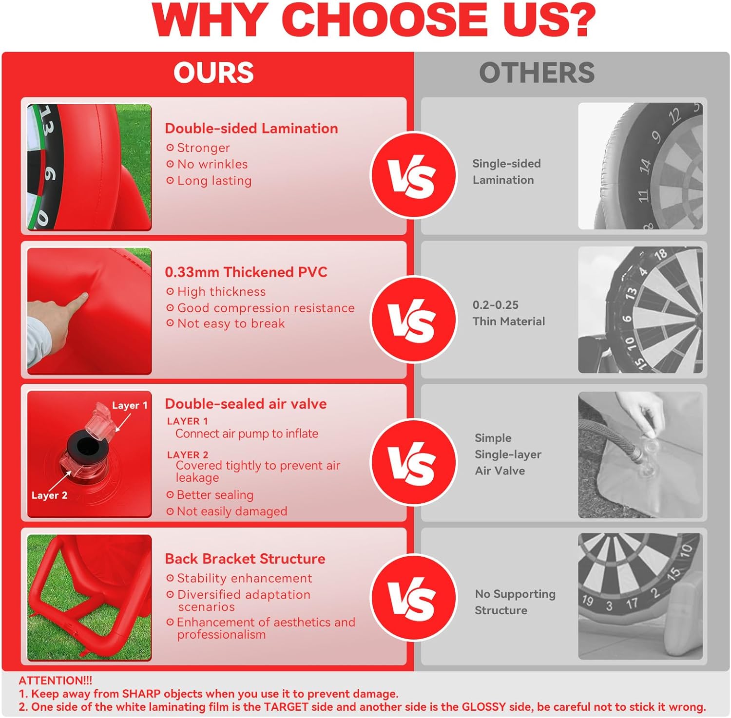 - Excellent Manufacturing Process: Inflatable dart board is made of waterproof premium-quality PVC material, which is not easy to be corroded or scratched, and can effectively extend its service life. Its surface is covered with magic strap fabric with good adsorption, which can hold the balls firmly, helping to accurately measure the position and record the score