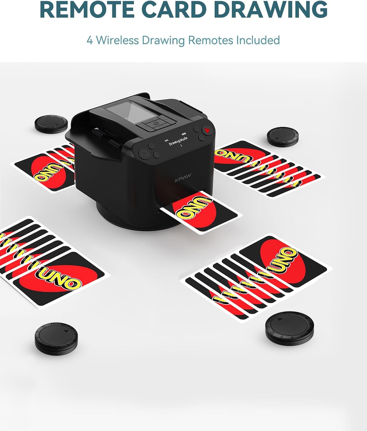 - [DRAWING REMOTES] – The 4 included drawing remotes let players draw cards remotely by simply pressing the remote, perfect for games like UNO, Rummy and Phase 10 which need to draw cards frequently. Paired for each player, the machine automatically draws a card in the direction of the corresponding paired remote position when press the remote, making it easier to manage card drawing during a game