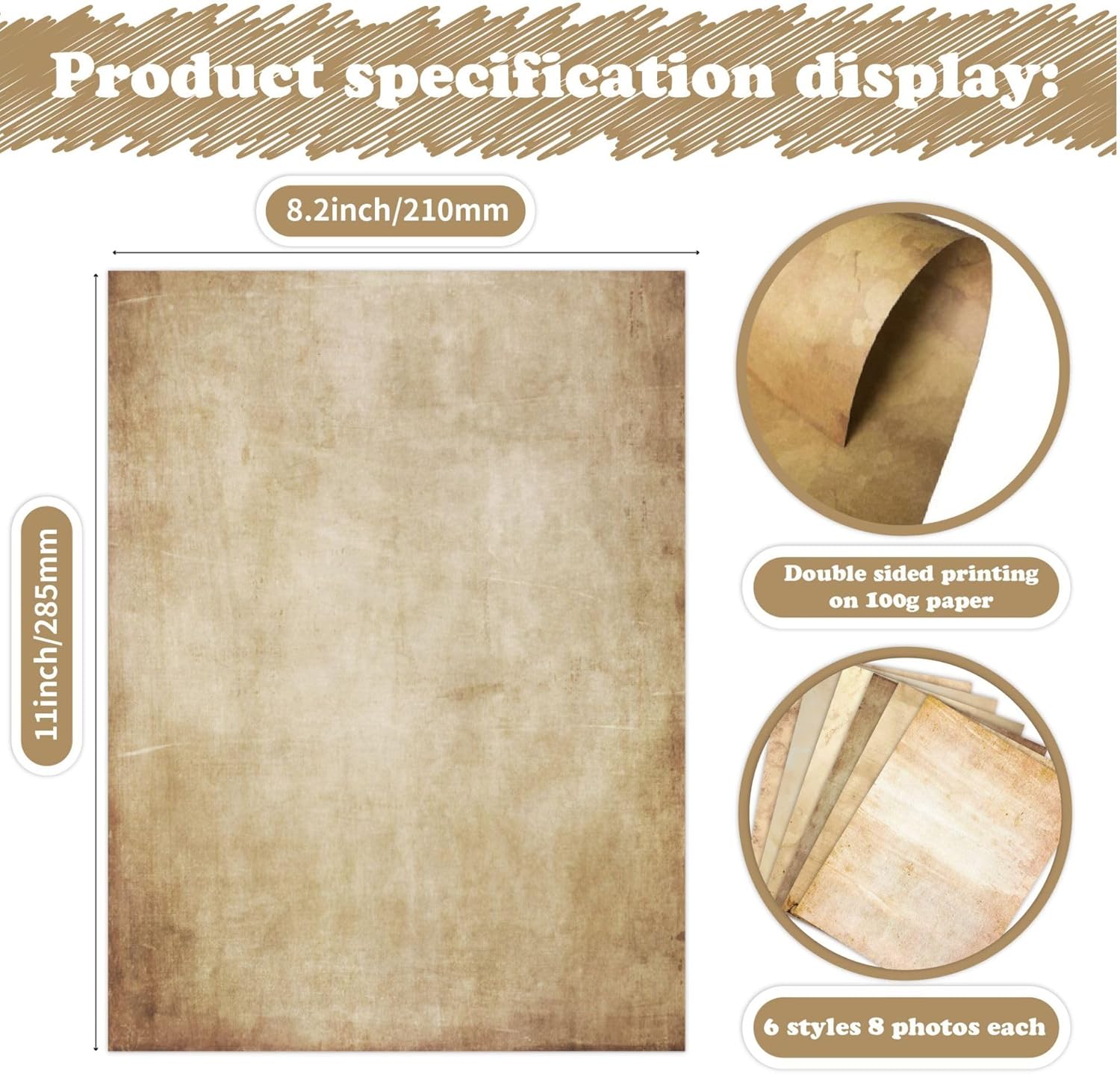 - Premium Vintage Design: This set includes 48 sheets of antique-style parchment paper, featuring 6 unique vintage designs with a rustic and aged look. Each sheet measures 8.3 x 11.2 inches, offering ample space for your creative projects.