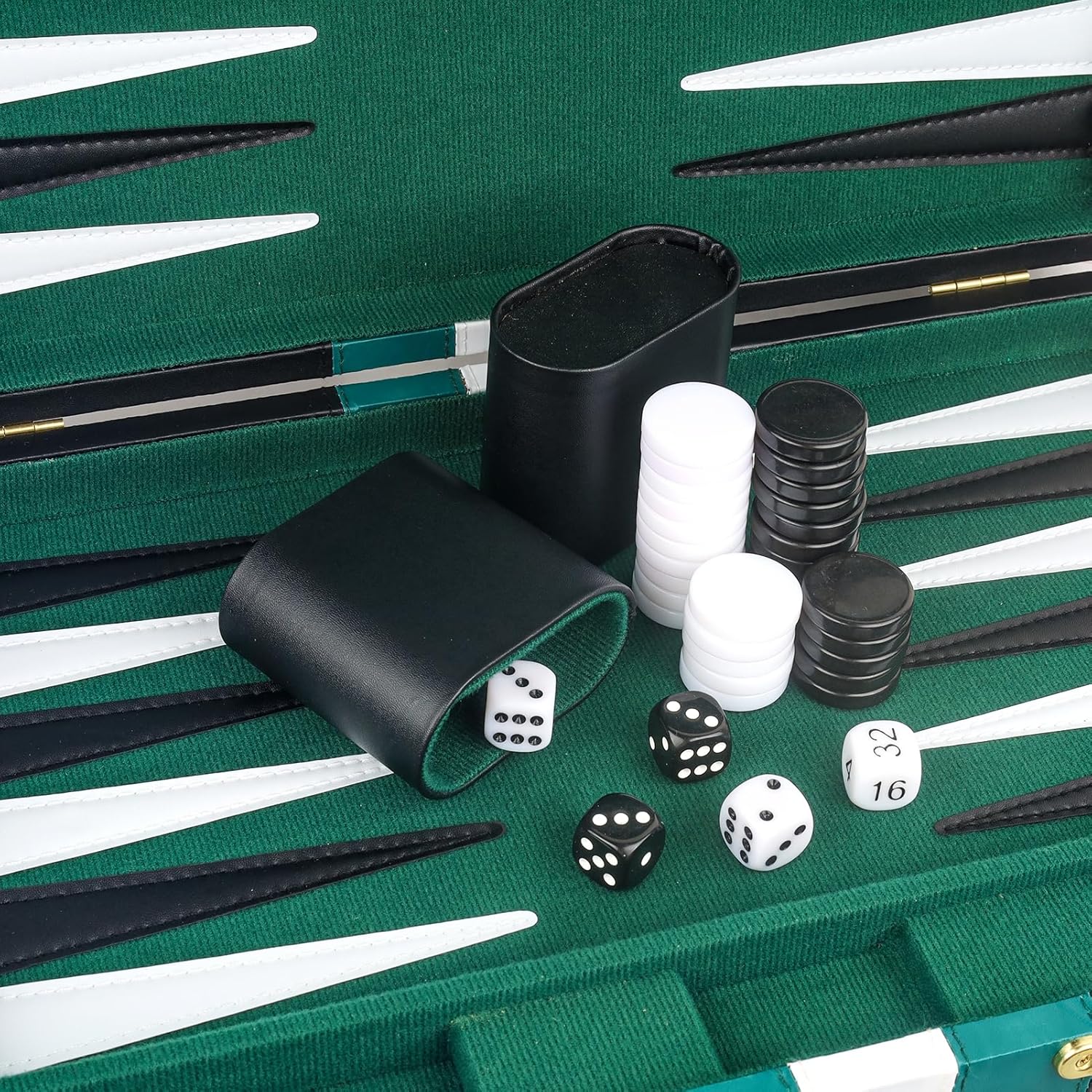 - The playing field is a soft velvety fabric with leatherette points sewn onto the surface, and green felt-lined leatherette dice cups to keep the dice rolling noise to a minimum