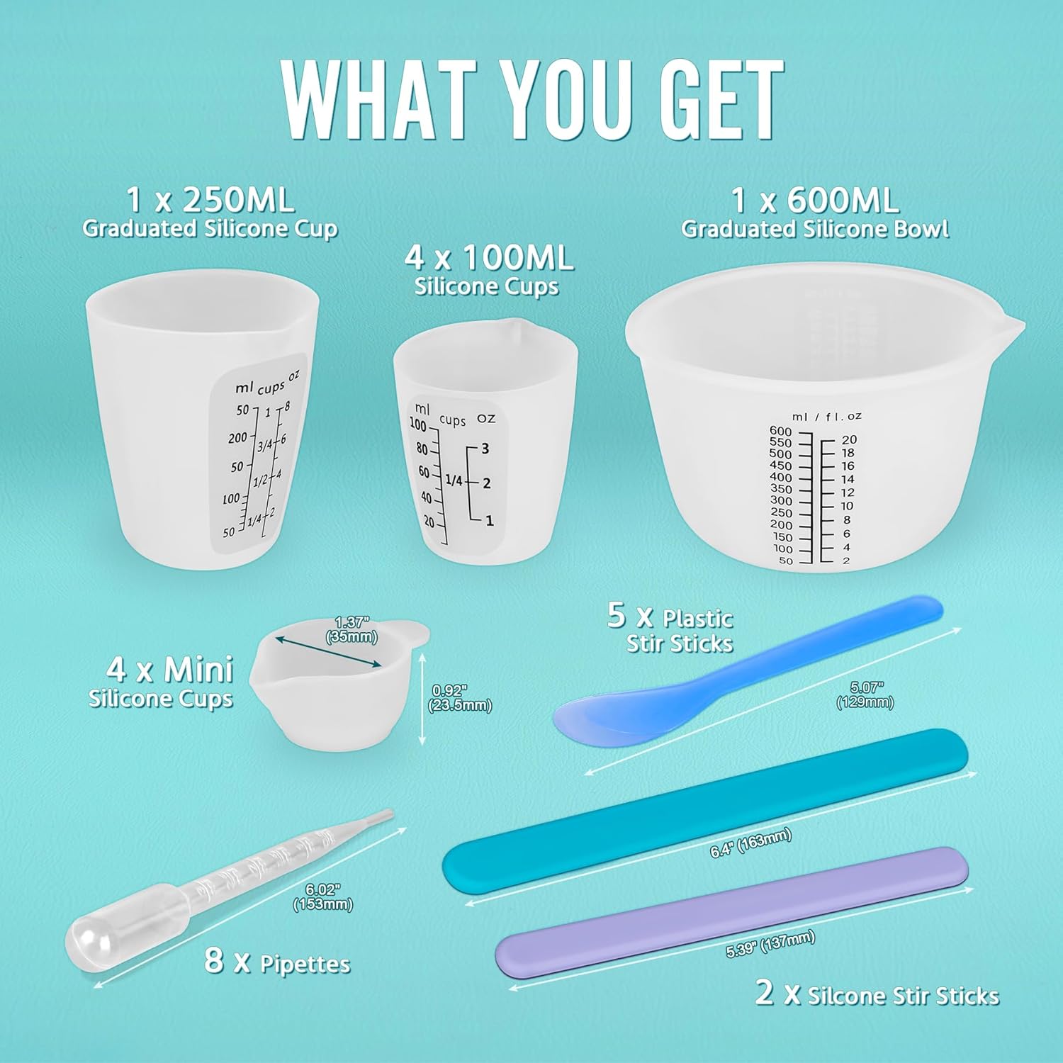 - 【SWIGRANCE Resin Mixing Cups Set with Black Measurements】 Includes 1 x 600ml graduated silicone bowl, 1 x 250ml graduated silicone cup, 4 x 100ml silicone cups, 4 x mini mixing cups, 2 x silcone stir sticks (1 long, 1 short), 5 x plastic stir sticks, 8 x 3ml pipettes for small volume transfer. Clearly visible black measurements are convenient to read when mixing resins or even other colored liquids.