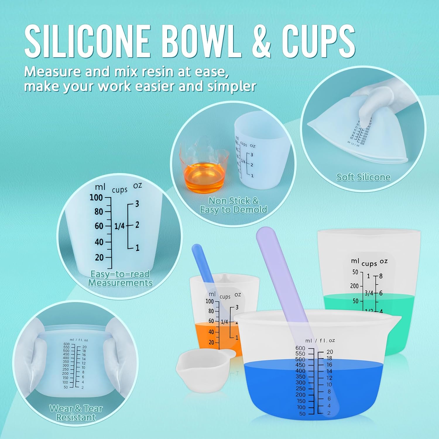 - 【600ml/20oz Resin Mixing Measuring Bowl】 600ml large capacity, wide mouth, more convenient for operation of large volume. We thickened the silicone bowl to ensure it's firm and stable during use. 250ml & 100ml measuring cups can help you to extract the mixture from the large measuring cups multiple times.