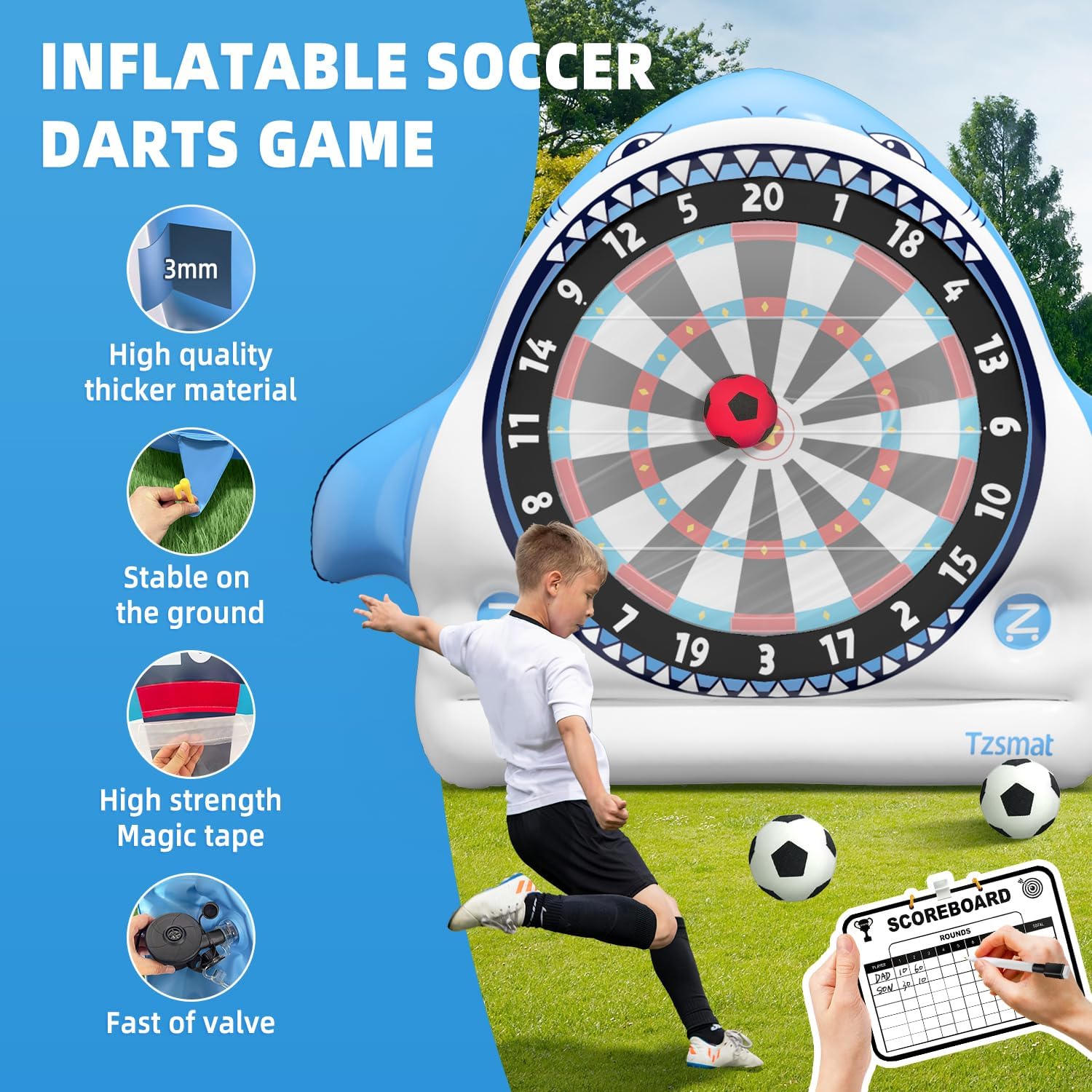 - Outdoor Games for Families: The soccer blow up inflatable dart board inflates over 7.5ft tall. withing the electric air pump, you can inflate the inflatable dartboard within 10 mins. You do not need to waste time at your yard soccer game with the fast of the valves system. Good giant games can make you have a good family time.