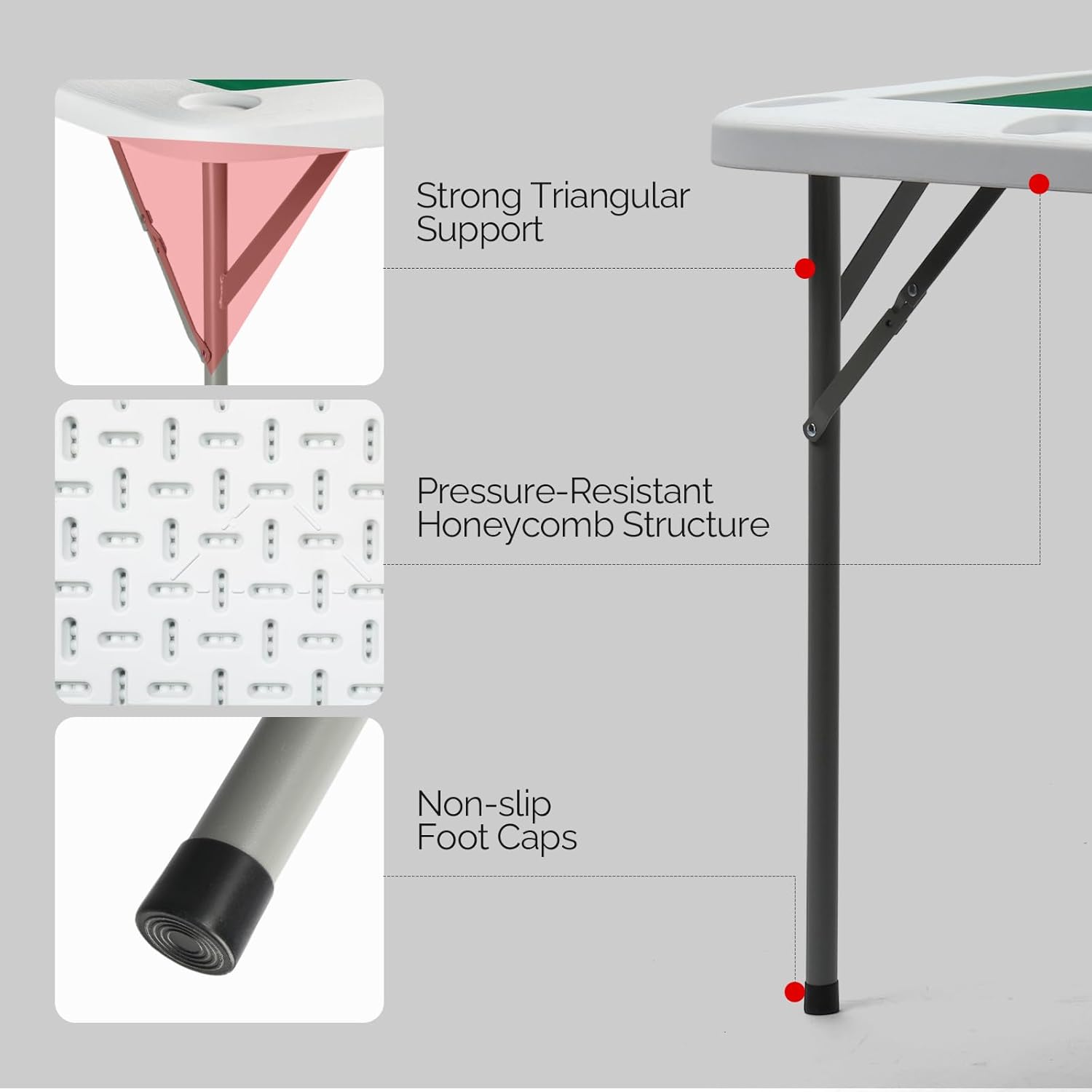 - 【Multipurpose Table】The multipurpose square folding table features white panels and a green nylon top. It fits on any flat surface and can be used for poker/ dominoes/ blackjack/ mahjong/ texas hold'em and any other type of game. It is the perfect choice for clubs, bars, game rooms, homes and other gathering occasions.