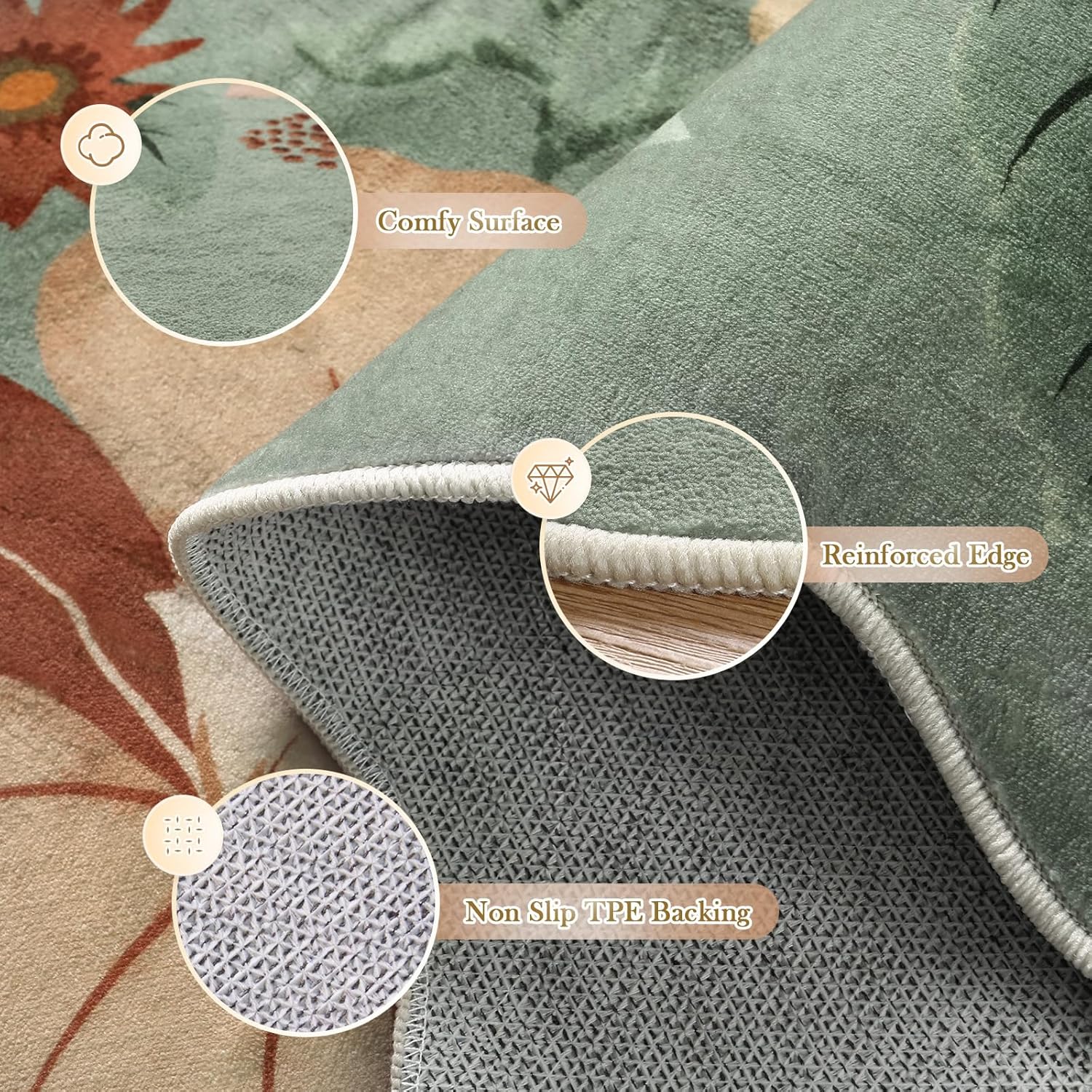 - Boho Floral Rug: Gorgeous and unique washable area rug, no more straight edges, delicate floral pattern adds a splash of color, adds beauty and class to any space, stylish and functional.