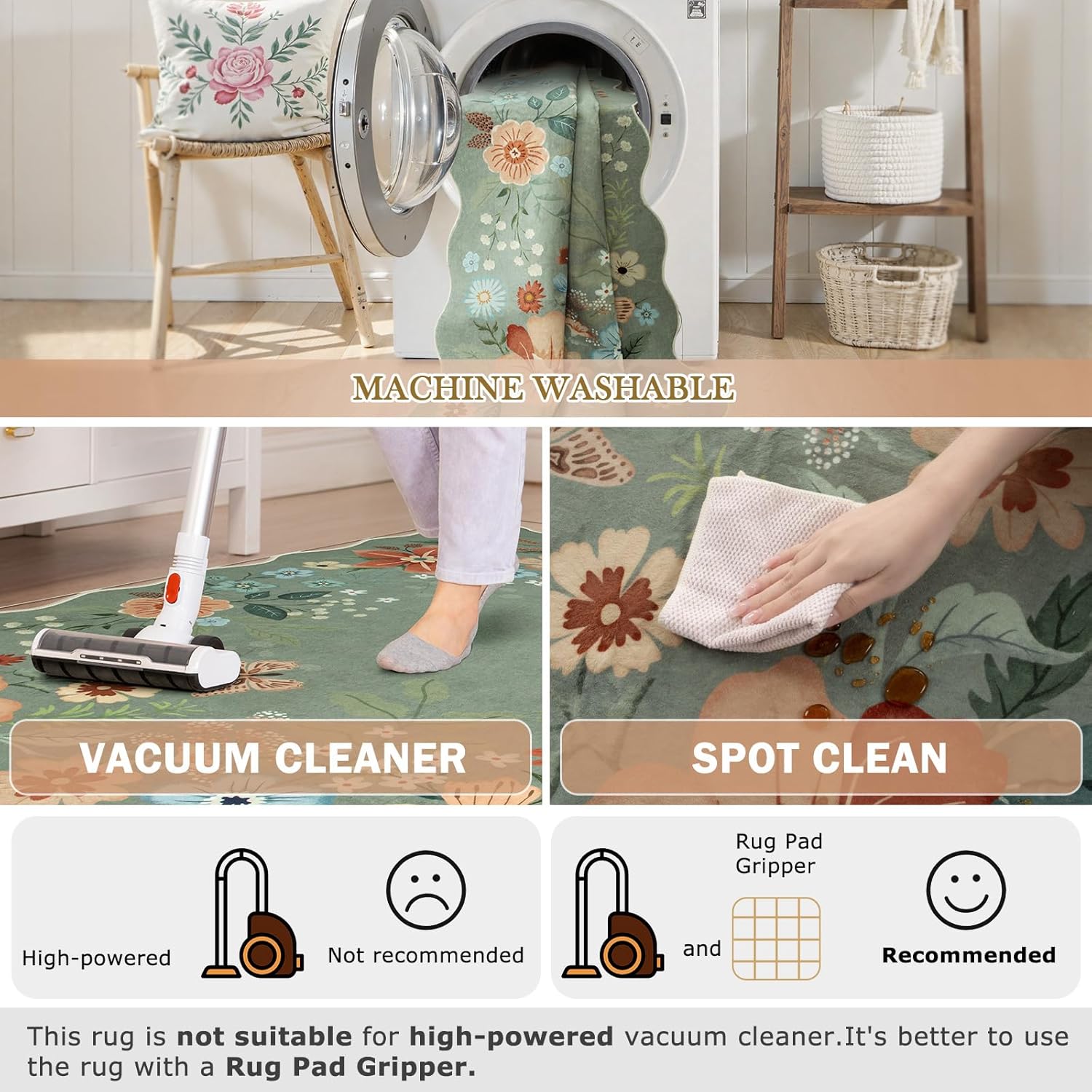 - Machine Washable Rugs: Beverage stains can be easily solved with just a rag; dust/pet hair can be used to sweep robot/vacuum cleaner; deep cleaning just throw it into the washing machine, efficient solution to the difficulty of maintenance. (Due to the thin thickness, it is recommended to use a low-power vacuum cleaner)