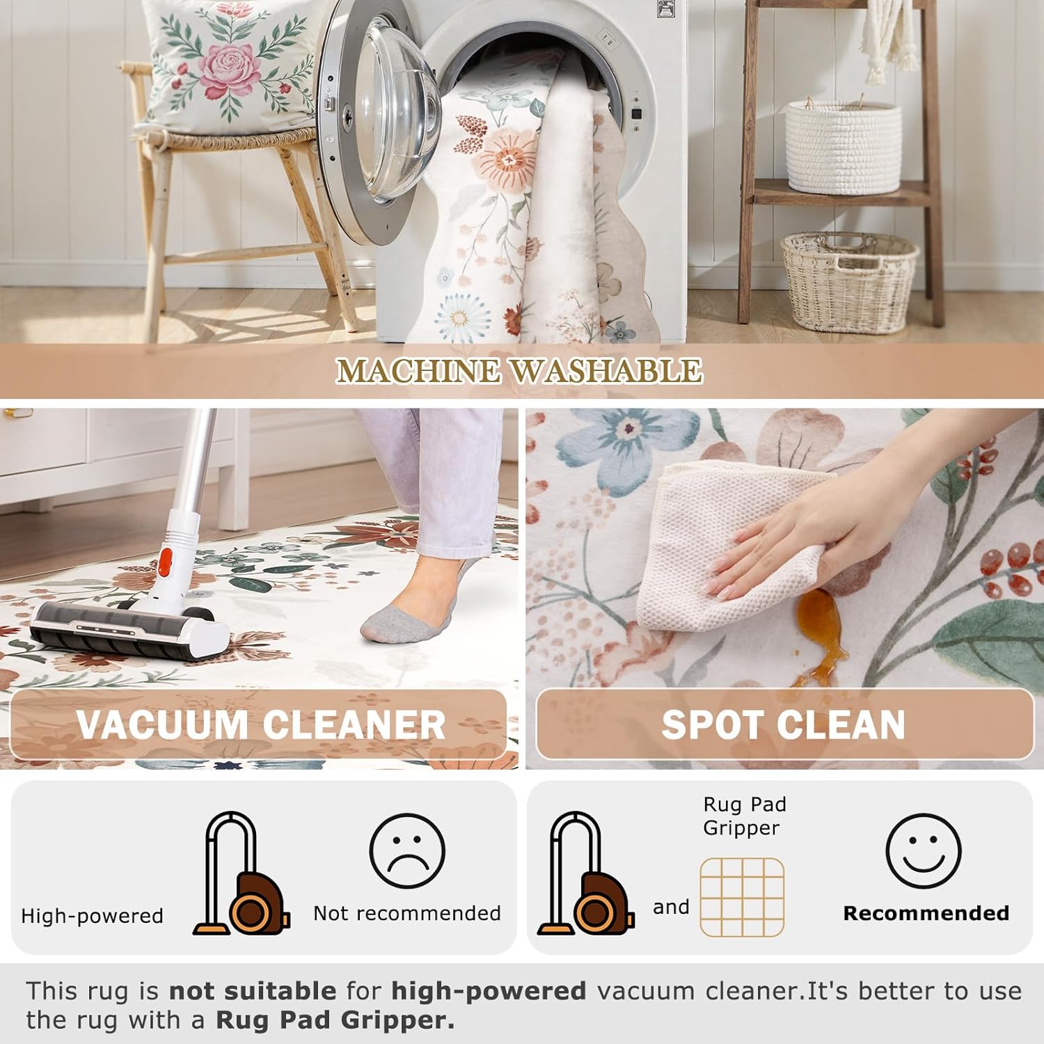 - Machine Washable Rugs: Beverage stains can be easily solved with just a rag; dust/pet hair can be used to sweep robot/vacuum cleaner; deep cleaning just throw it into the washing machine, efficient solution to the difficulty of maintenance. (Due to the thin thickness, it is recommended to use a low-power vacuum cleaner)
