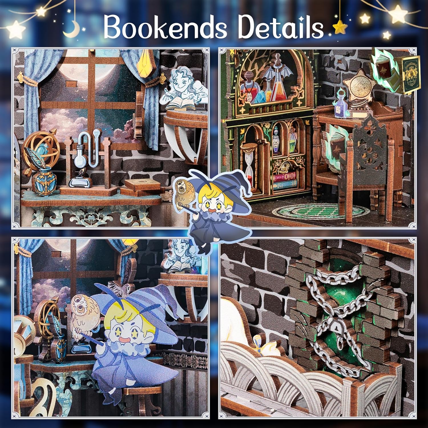 - 【Double Scene】This DIY book nook kit shows the core spirit and character of each faculty. The basement symbolizes strength and power with its mysterious atmosphere, while the stargazing room embodies the pursuit of knowledge with its towering towers and starry sky. The kitchen, on the other hand, demonstrates the value of co-operation and friendship in a warm and bright environment.