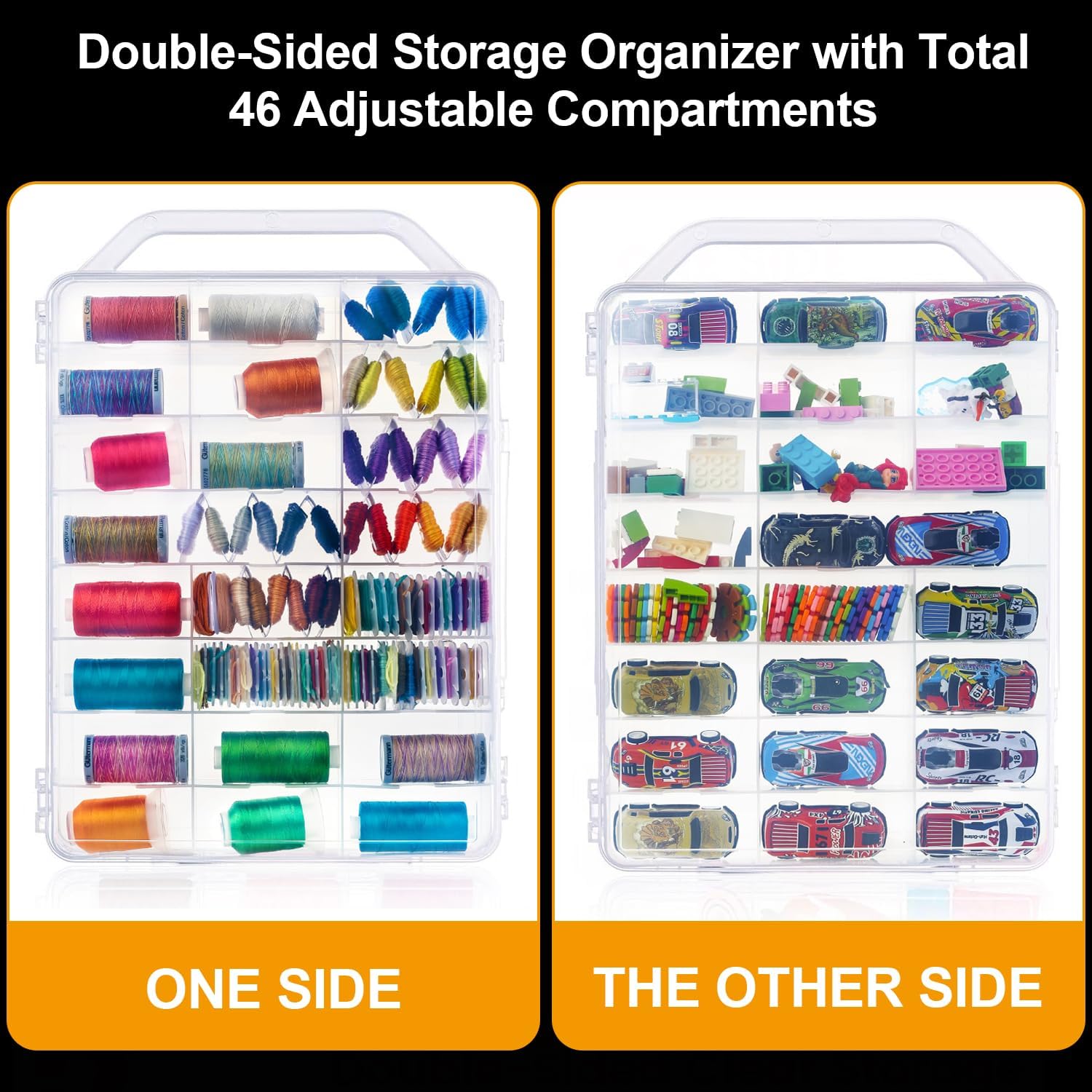 - Double-Sided Storage: 46 compartments on both sides keep threads and buttons tidy. Perfect for use as a sewing box or thread organizer. Box size: 13"L x 9.8"W x 3.2"H.
