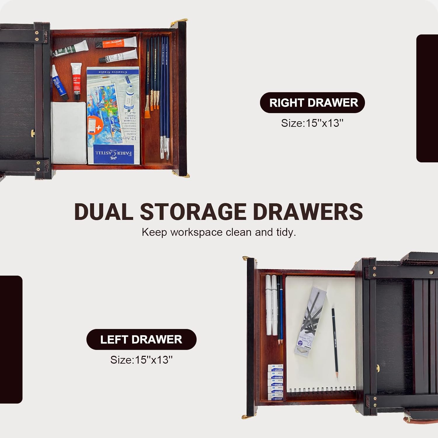 - Two Storage Drawers: We redesign the draws constructions, we have 2 drawers in both sides. Each drawer is divided into 2 compartment, It provide extremely large space to organize your art supplies. You can keep pens, brushes & pigment in one drawer. Put paper, small canvas ,markers in another. Keep your workspace clean and tidy.