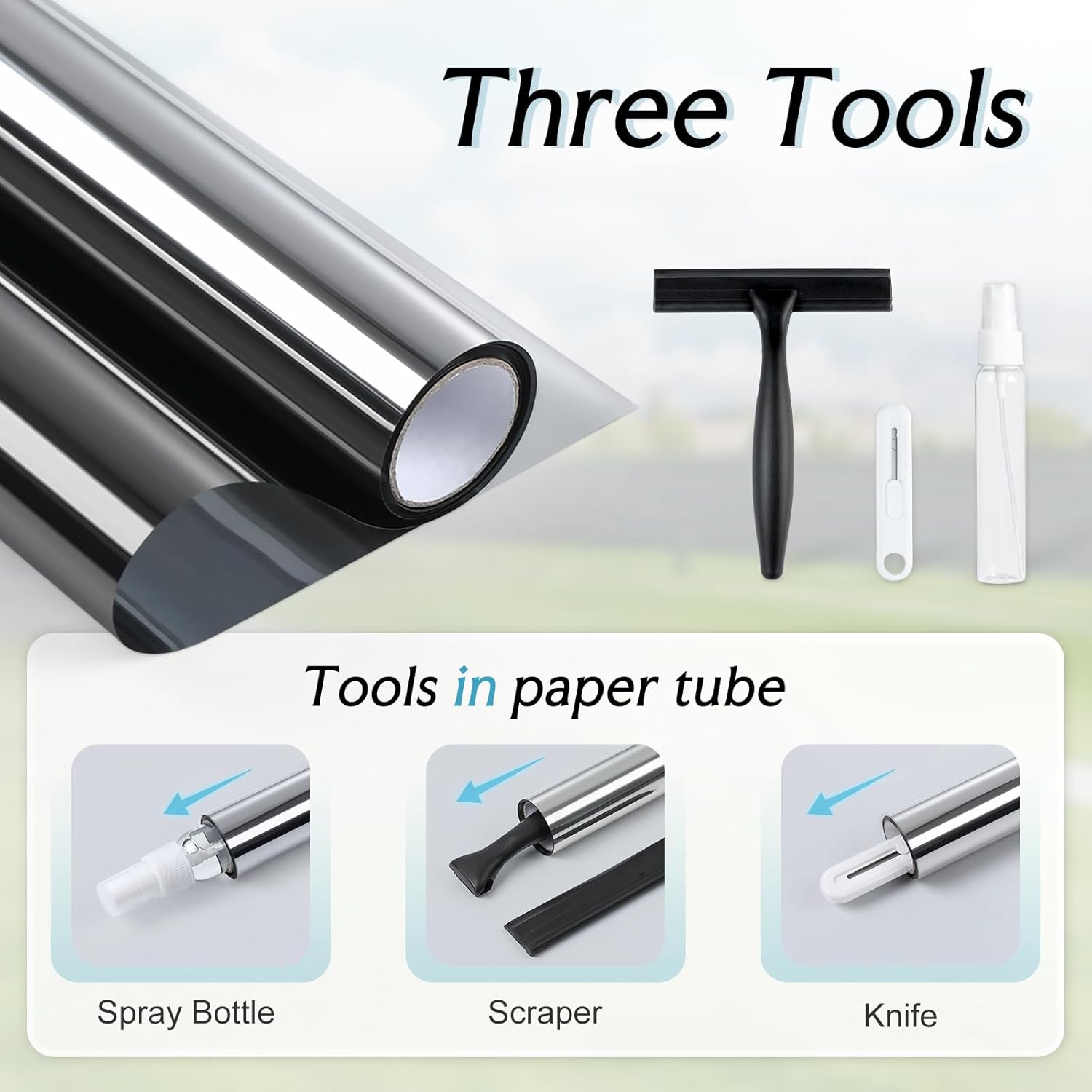 - Free Tools, Do More with Less: The one way window film package includes three free tools: a squeegee, a knife, and a sprayer. It saves money and time while making installation easier. For superior results, thoroughly clean the glass, peel off the backing, and spray plenty of water on both the window and the film
