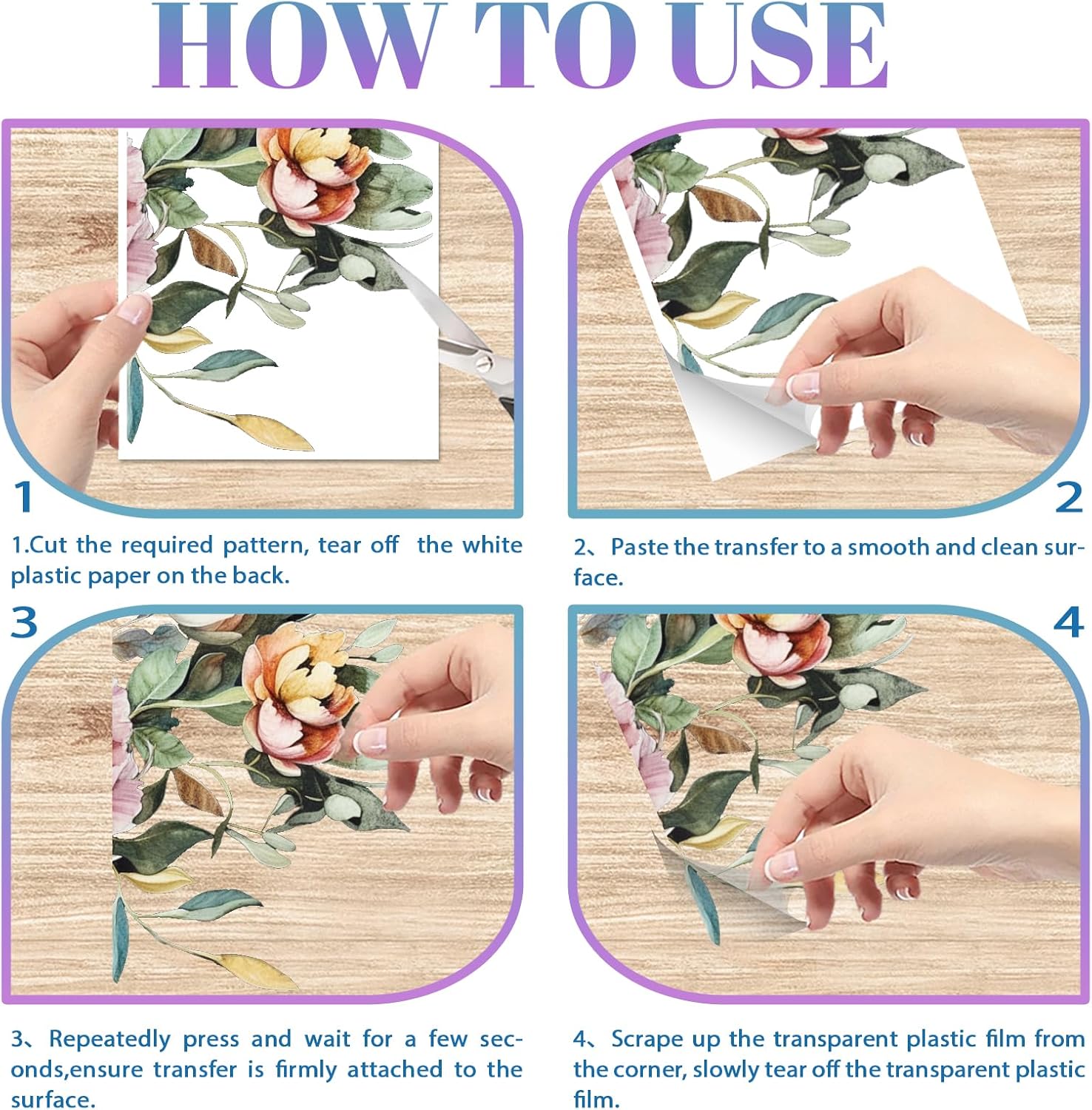 - Package Includes: 4 sheets of waterproof decorative transfer stickers, designed with peony flowers and 1 pc scraper. Each size of the furniture transfer sticker is about 11.8 inch (300mm) long and 5.9 inch (150mm) wide.