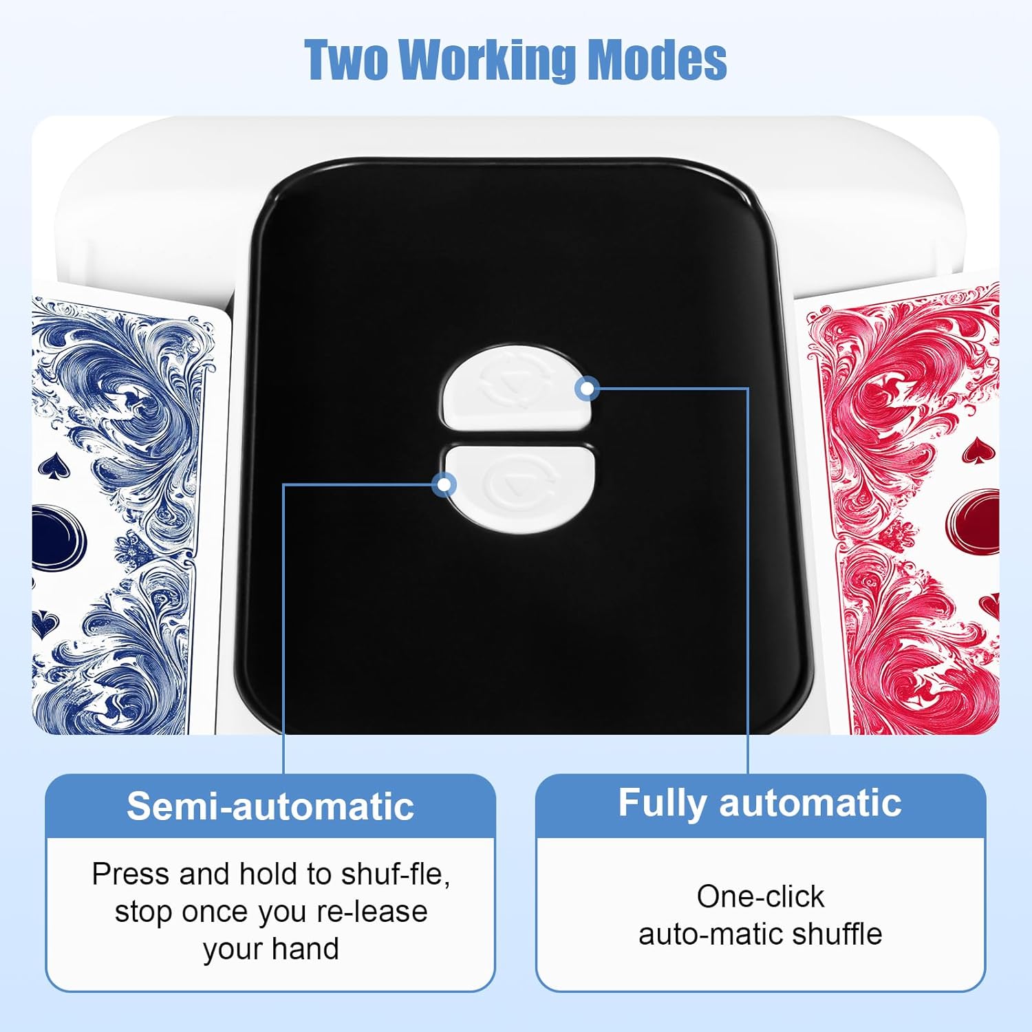- Two Smart Modes for Total Control 👆Choose fully automatic mode card shuffler, or semi-automatic mode (press and hold). Great for poker nights or precise dealing needs.