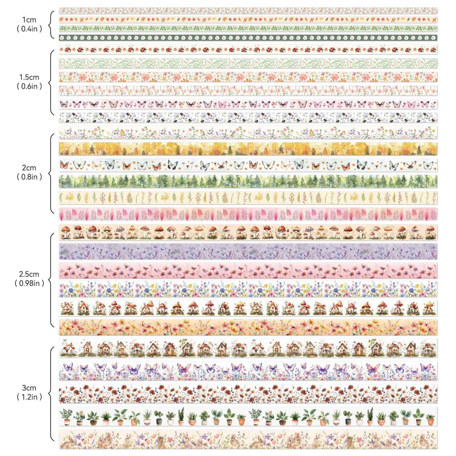 - [27 Rolls vintage designs] 27 Rolls Washi Tape, 0.39 inch(10mm) x 4 Rolls, 0.59 inch(15mm)wide x 6 Rolls, 0.79 inch(25mm) x 6 Rolls, 0.98 inch(25mm) x 6 Rolls, 1.18 inch(30mm) x 5 Rolls, each roll is 3m. 27 different patterns, this vintage forest animal plant washi tape adds color and vitality to the pasted items, making daily life more interesting.