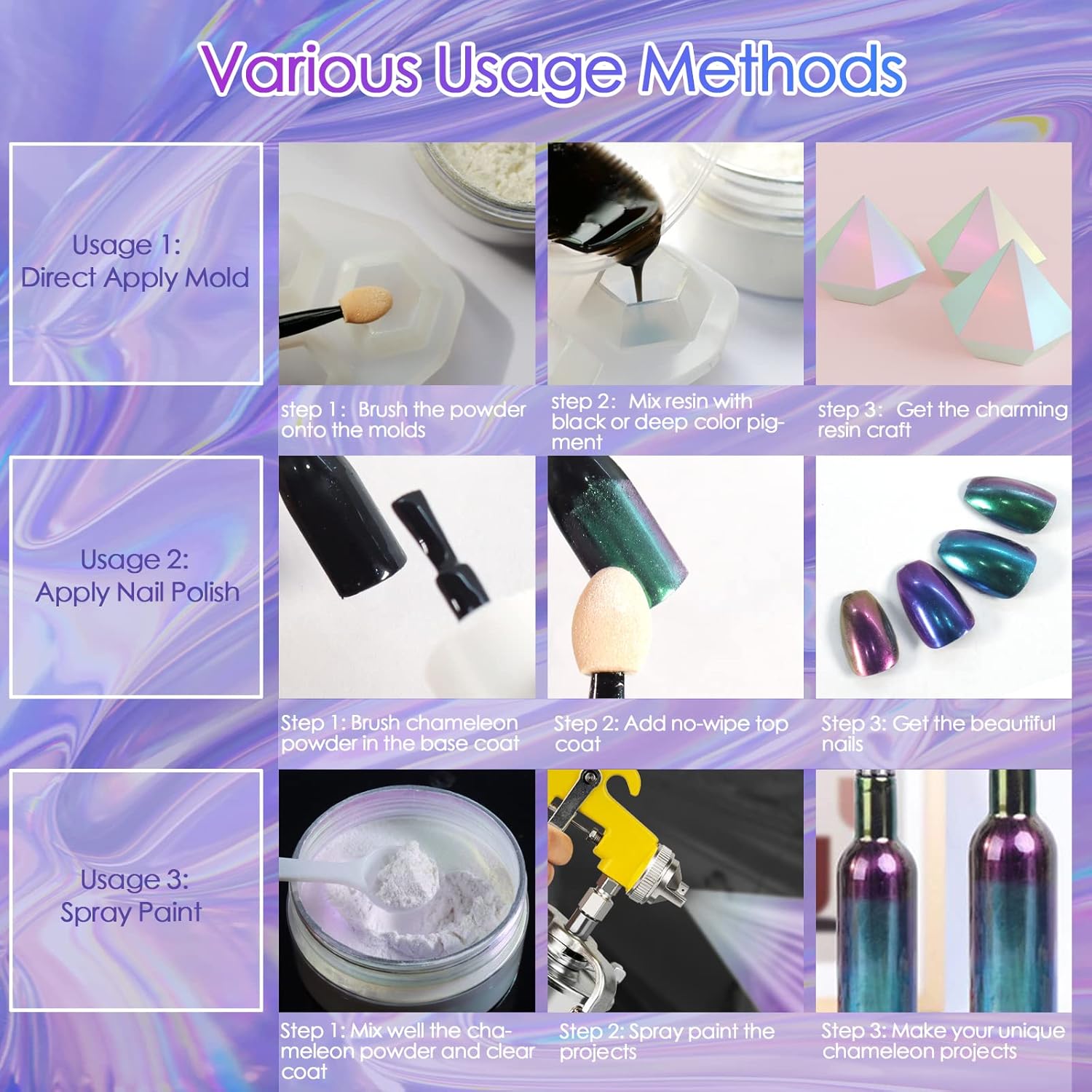 - 🫧Mica pigment's 3 Different Effects: Different color bases create a different effect surface. Applying pearl powder on a white background will produce aurora effect, and on a black background will be chrome effect. Mixing a small amount of pearl chrome powder into the black resin will produce like starry sky effect. So easy to use to get the variety of colors you’re looking for!