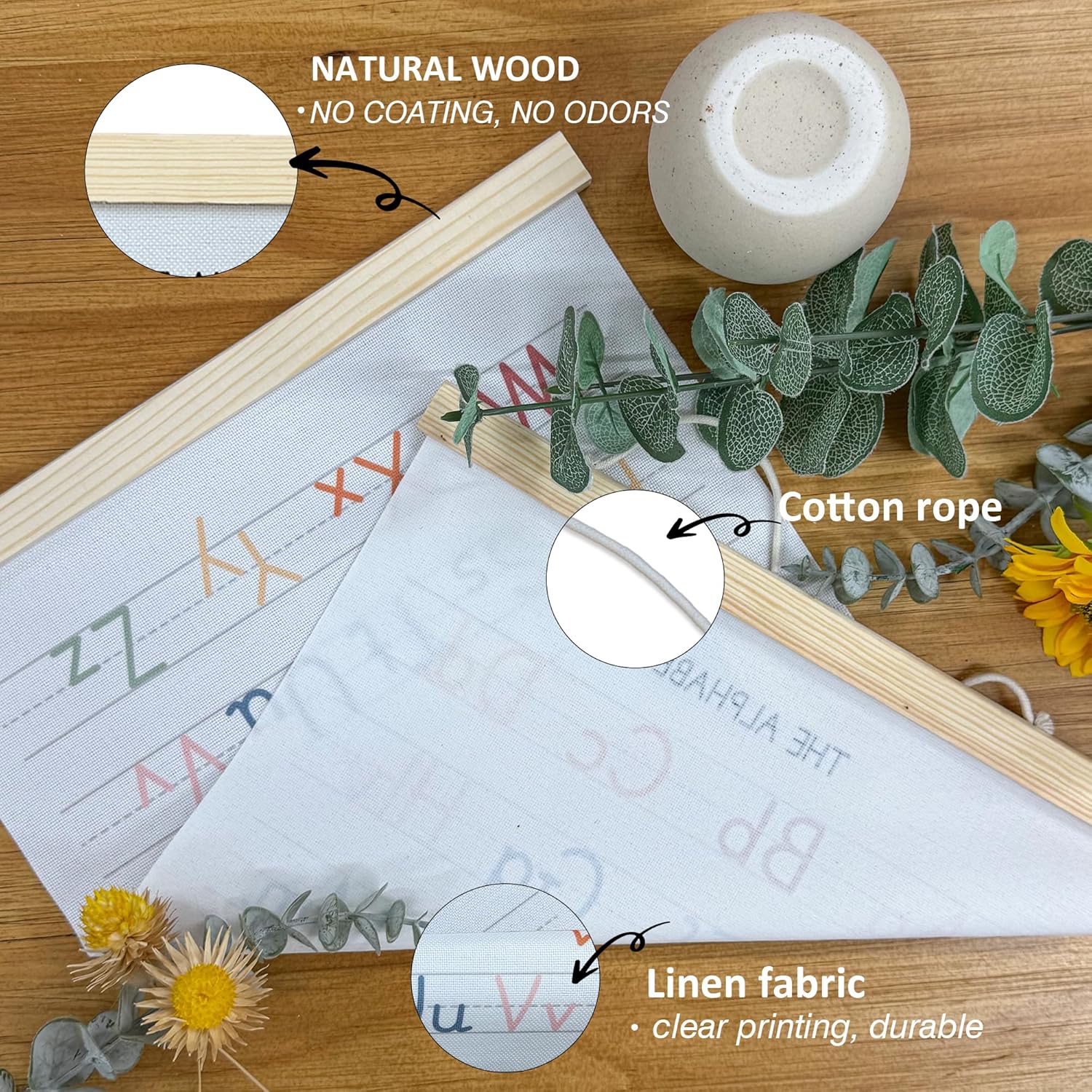 - Product Dimensions: Versatile 2 pieces per set 12 x 21 inches, alphabet banner a fun and toddler educational posters piece that features a canvas scroll with colorful ABC poster and numbers and wooden frames.