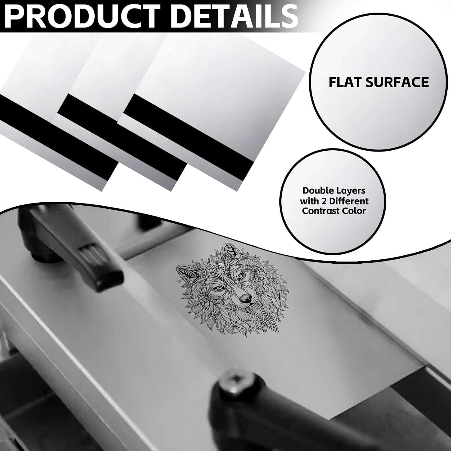 - Brushed Silver/Black Two-Tone Engraving Sheet---Designed for laser engraving, the double-layer acrylic material allows for fast, cost-effective engraving, resulting in a high-contrast permanent mark.