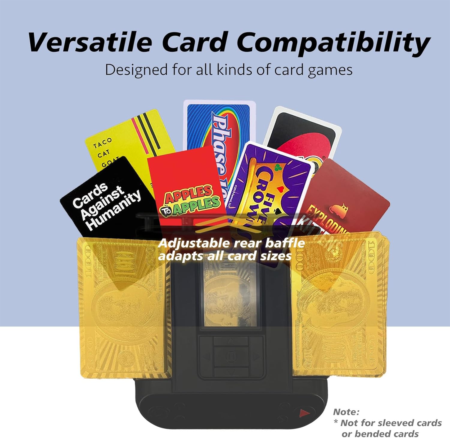 - Versatile Card Compatibility: Has an adjustable card baffle and open-sided trays that can accommodate different card sizes, from standard poker decks to specialty game cards like those used in UNO or Canasta