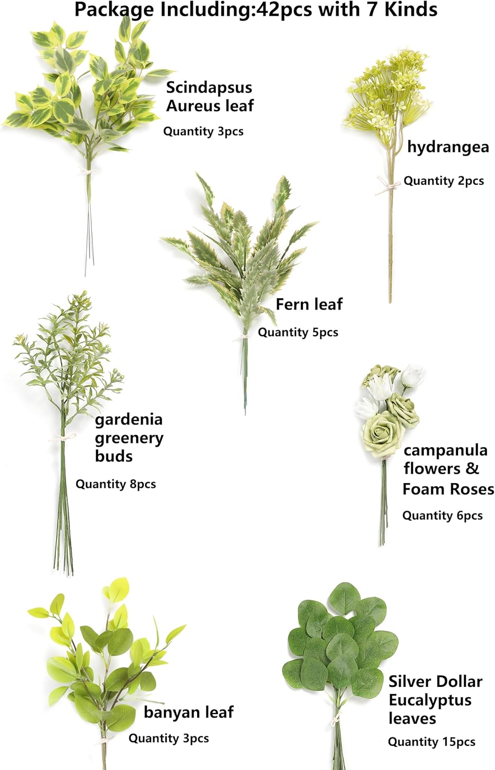 - Package Including:42pcs with 7 Kinds;campanula flowers &Foam Roses x6,Silver Dollar Eucalyptus leaves x15,hydrangea x2,Fern leaf x5,gardenia greenery buds x8,banyan leaf x3,Scindapsus Aureus leaf x3,