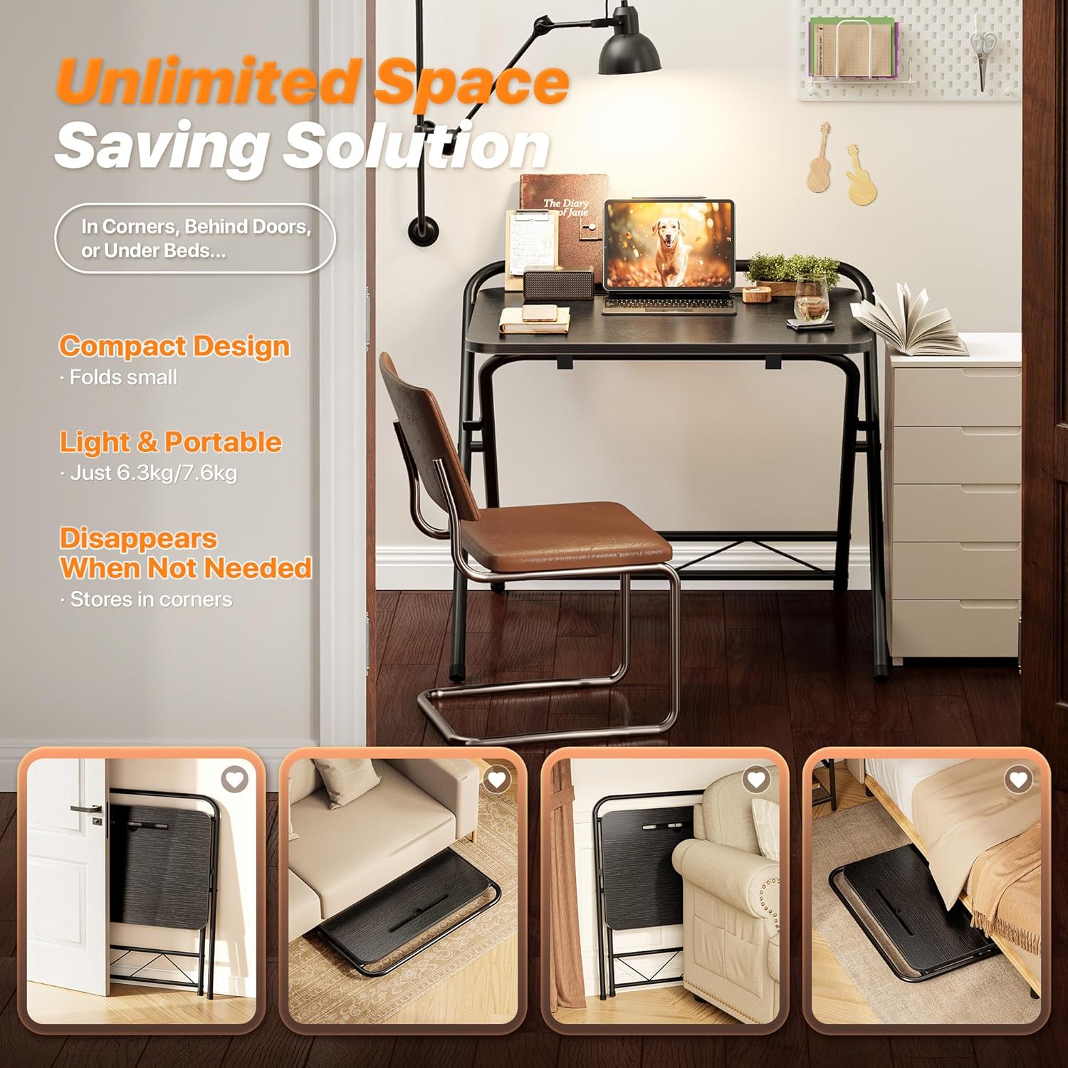 - 【Compact, Foldable & Space-Saving】Perfect for small spaces! Fold Size: 3.15'' X 26.6''X 36.6''. This lightweight foldable computer desk tucks neatly under beds, behind sofas, against walls, or in closets, small dorm. When you need more room, simply fold this office desk up and store it away. Ideal for maximizing your space