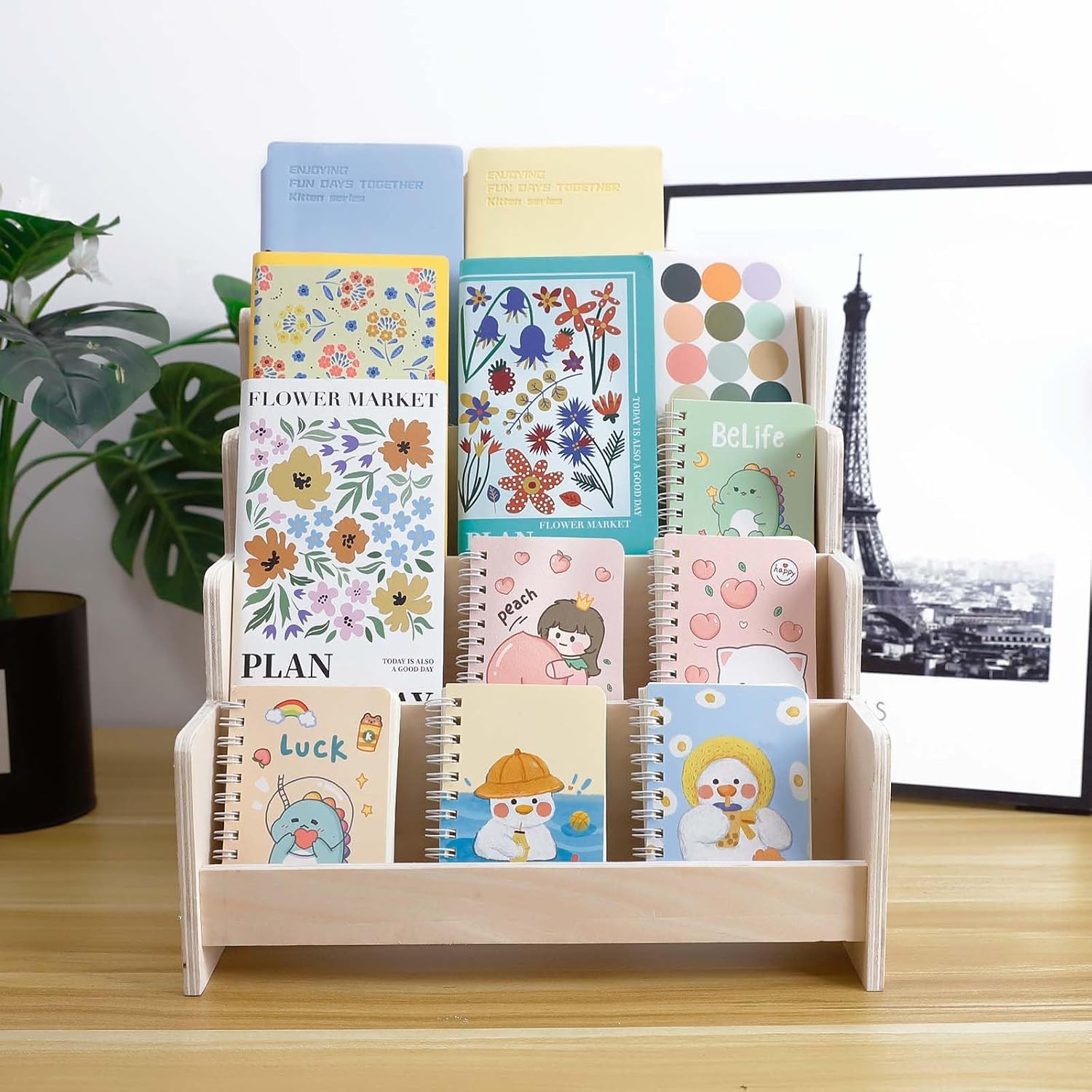 4-Tier Wooden Greeting Card Display Stand, Sticker Organizer Rack, Retail Counter Holder for Postcards and Photos& Stationery Vendors (Burlywood)