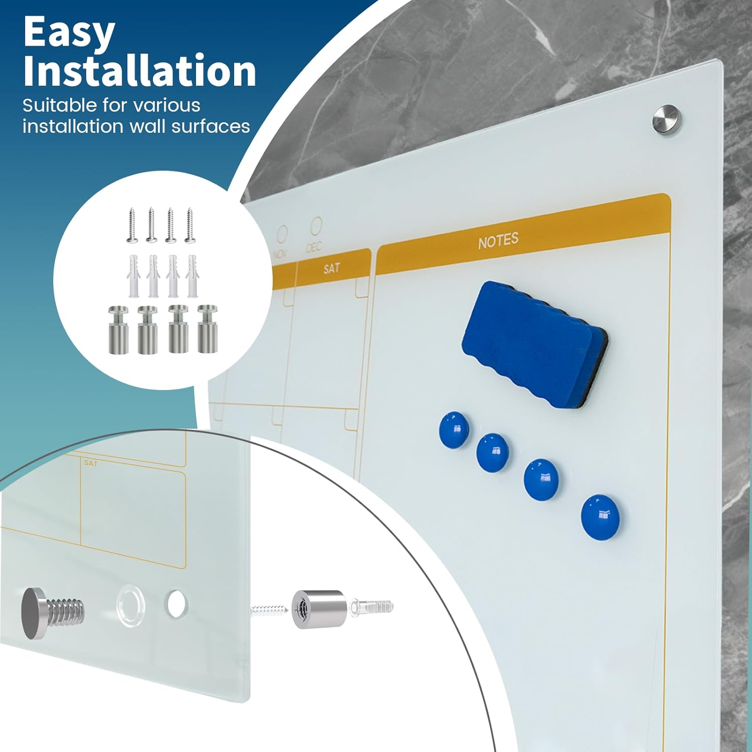 - Complete Set: including 1 glass magnetic dry erase board calendar,1 detachable aluminum tray,4 neodymium magnets,3 marker pens,a set of installation hardware,all necessary accessories provided for immediate use.We recommend to use professional neodymium magnets for glass whiteboards.