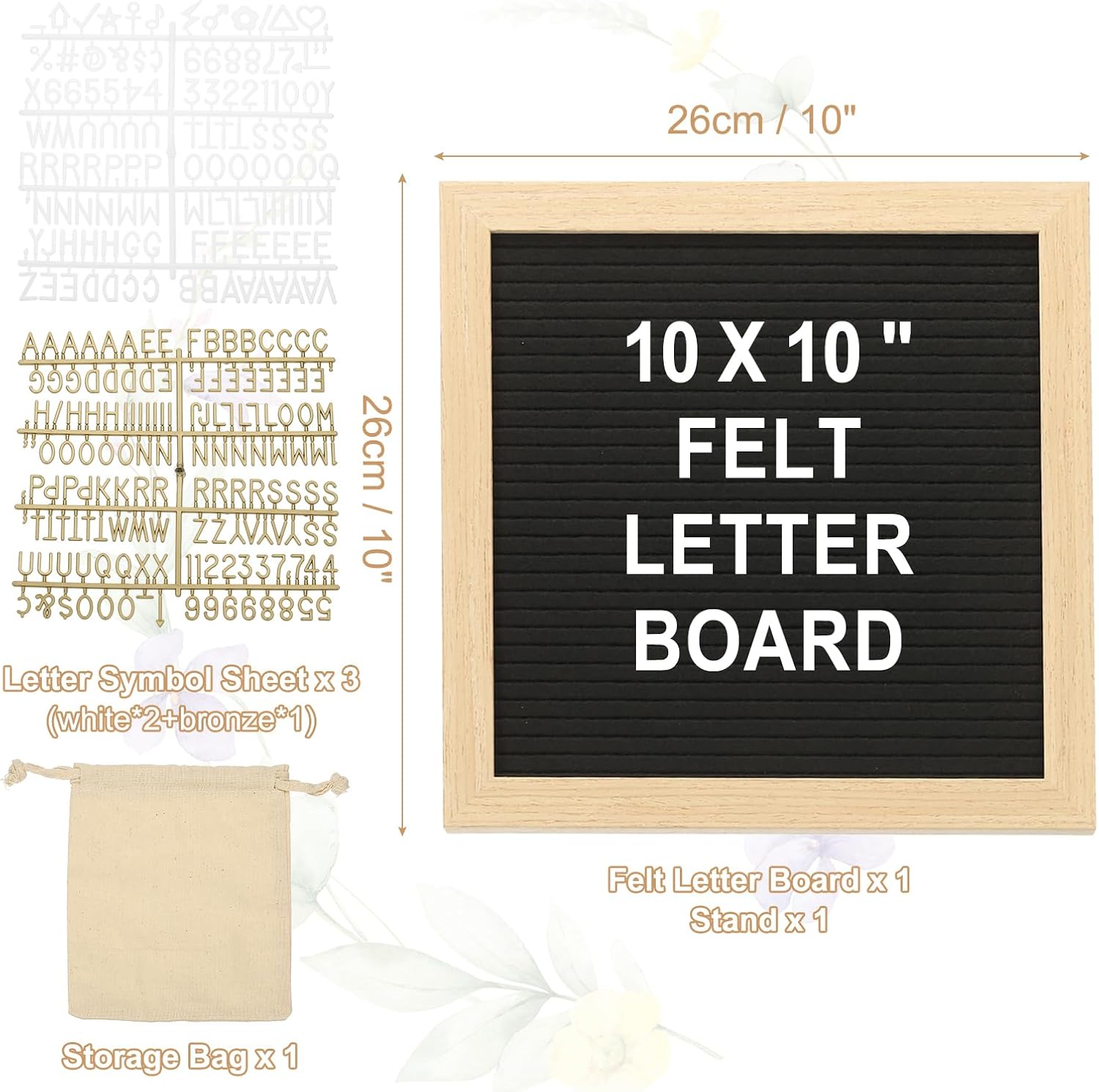 - Material: Wood, Felt, Plastic;Board Color: Black Wood;Letter Color: White Bronze;Size: 26x26cm / 10x10";Installation Method: Hanging, Stand Supported;Accessories: Storage Bag, Stand;Package Includes: Message Board x 1, Letter Set x 3, Storage Bag x 1, Stand x 1
