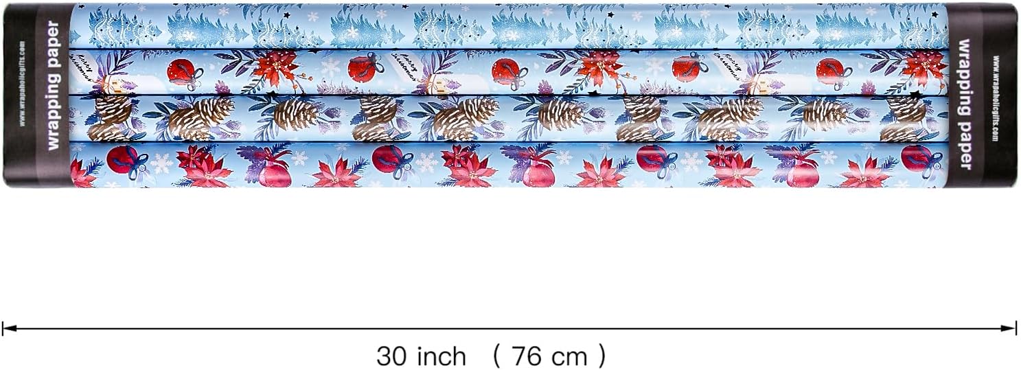 WRAPAHOLIC 30 Inch Christmas Wrapping Paper Roll - Jumbo Roll Red and Blue Snow Globe, Pinecone, Poinsettia, Christmas Tree Wrapping Paper - 4 Rolls - 30 Inch x 120 Inch Per Roll