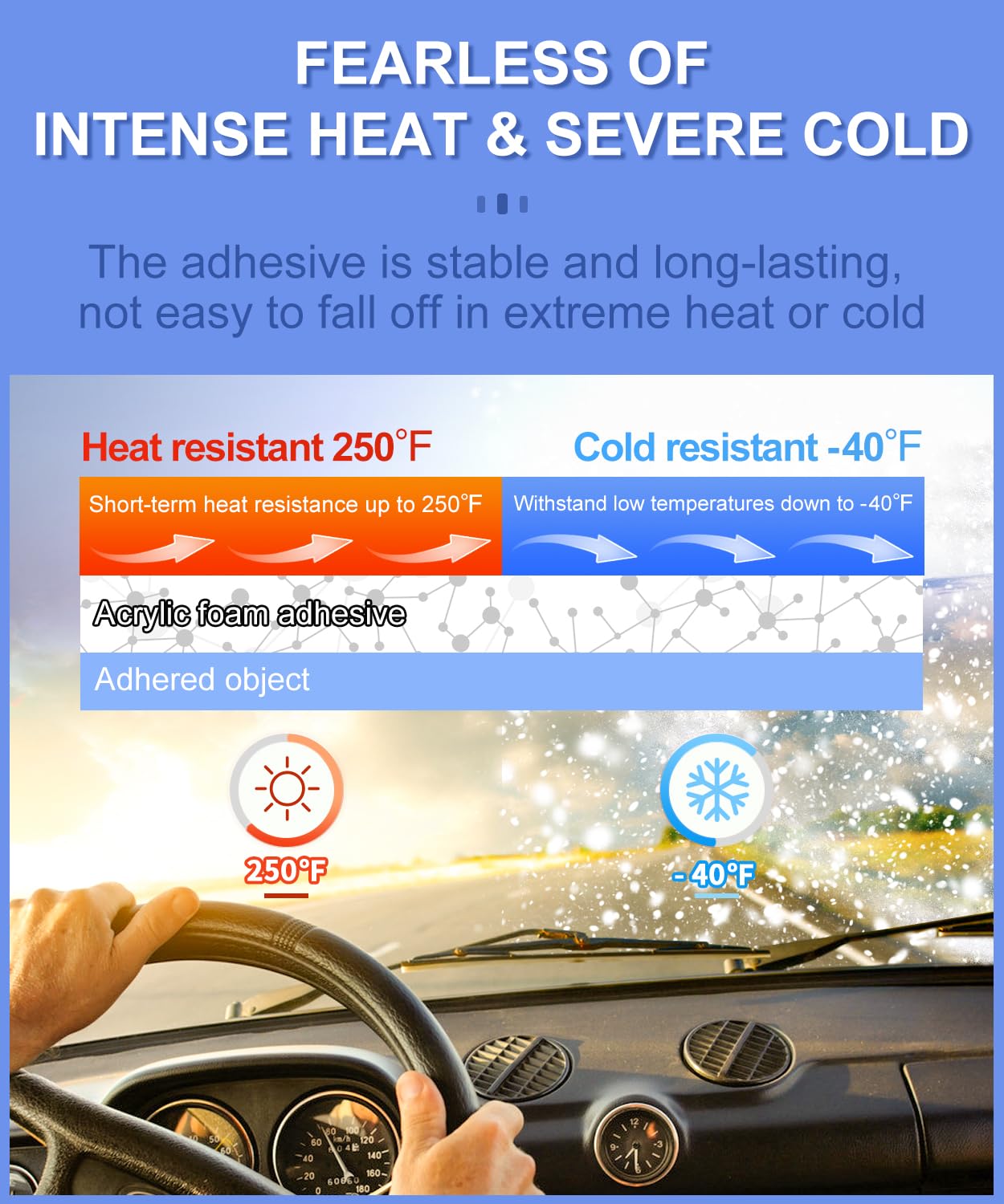 - WEATHER RESISTANCE:Temperature use range is -40℉ to 250℉, provides superior adhesion under extreme conditions,Heat Resistan and can be used in outdoor environments for long-term use.(If the construction temperature is below 50°F, it can be heated with a hair dryer for 15 seconds.)Made of 3M VHB GPL-110GF Tape, it uses fully sealed foam to isolate water vapor, which you can use in bathrooms, kitchens and other wet outdoor environments.