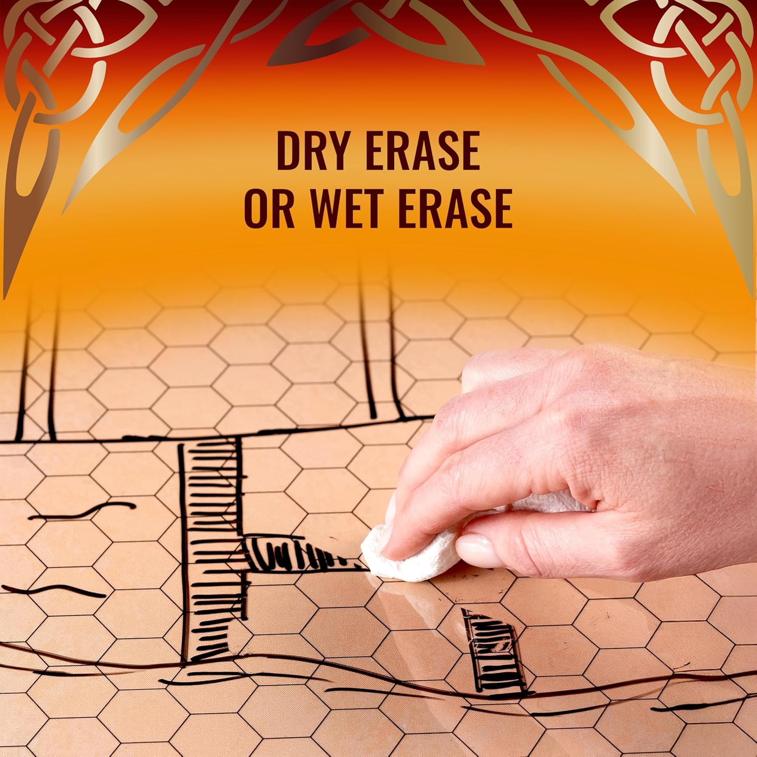 - 1-inch Square or Hexagon Grids: Draw your master plans on one of the 2 clear acrylic dry erase mats with square or hexagon grids that fit in the faux leather corner pockets. This is the ultimate dnd map to complete your dnd table and dnd starter set.