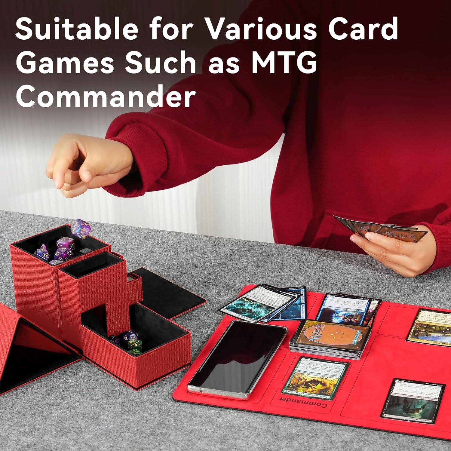 Dice Tray & Dice Tower Storage Box, 3 in 1 Dice Holder Case (Dice Rolling Tray, Rolling Tower, Storage Drawers), Leather Magnetic Closure DND Accessories Gifts for RPG MTG, Red/Black