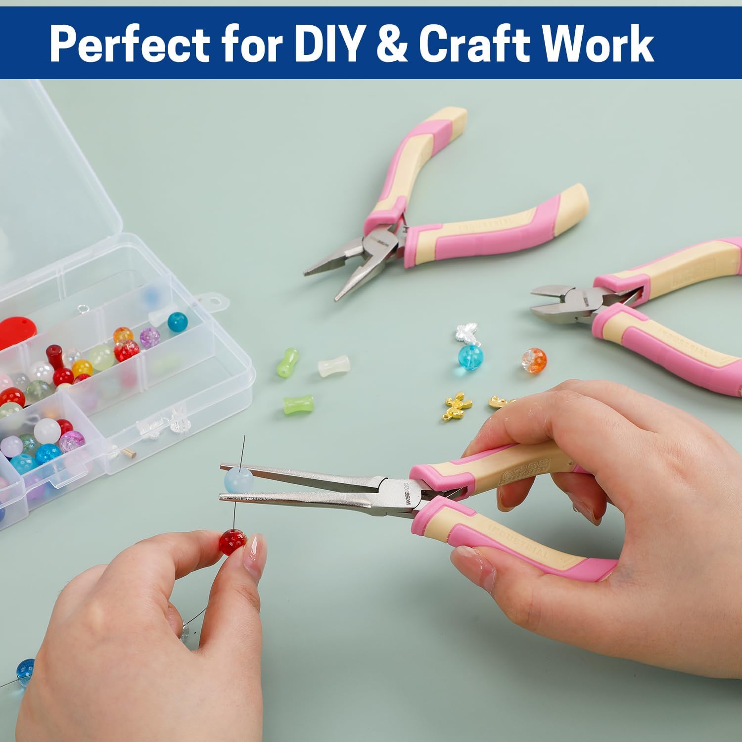 - 3PCS Mini Pliers Set: Includes needle nose pliers, long nose pliers, diagonal pliers, jump ring and tweezer. Available in two color options—orange & blue or pink & yellow. A thoughtful and practical gift for women, DIY lovers, jewelry crafters, model hobbyists, and home repair users.
