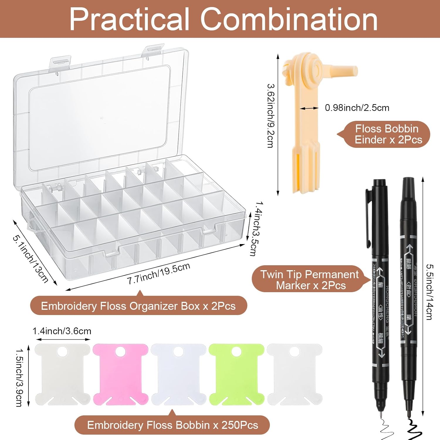 - Practical Combination: you will receive 250 pieces of embroidery floss bobbins in 5 colors, clear, white, blue, pink and green, 50 pcs of each color, 2 pcs floss bobbin winder, 2 pcs embroidery floss organizer boxes and 2 pcs twin tip permanent markers, easily meeting your daily requirements