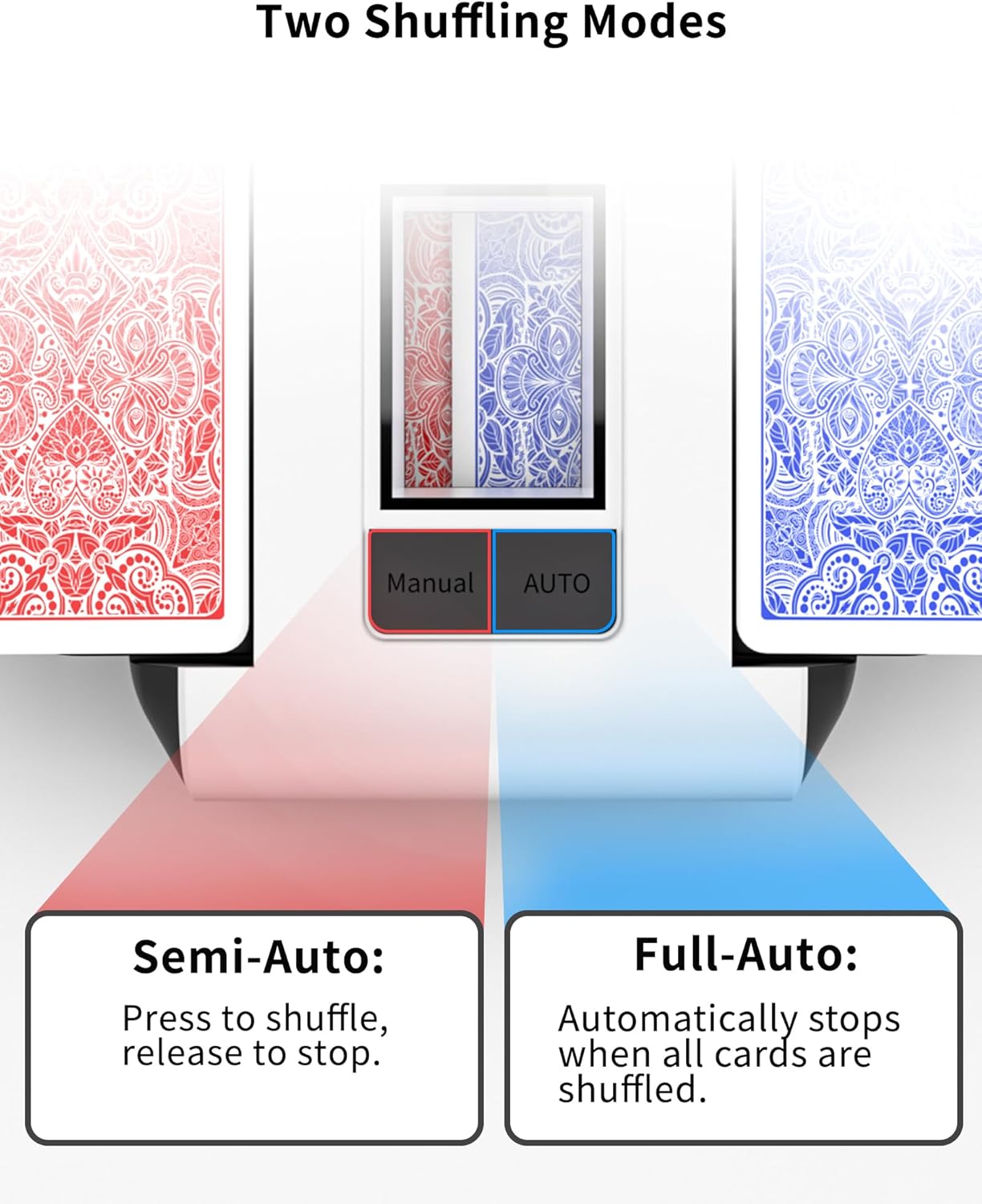 • 【Full-Auto & Semi-Auto Shuffle Modes】 In Full-Auto mode, a single press shuffles all cards and stops automatically. For precise control, Semi-Auto mode lets you hold to shuffle and release to stop.