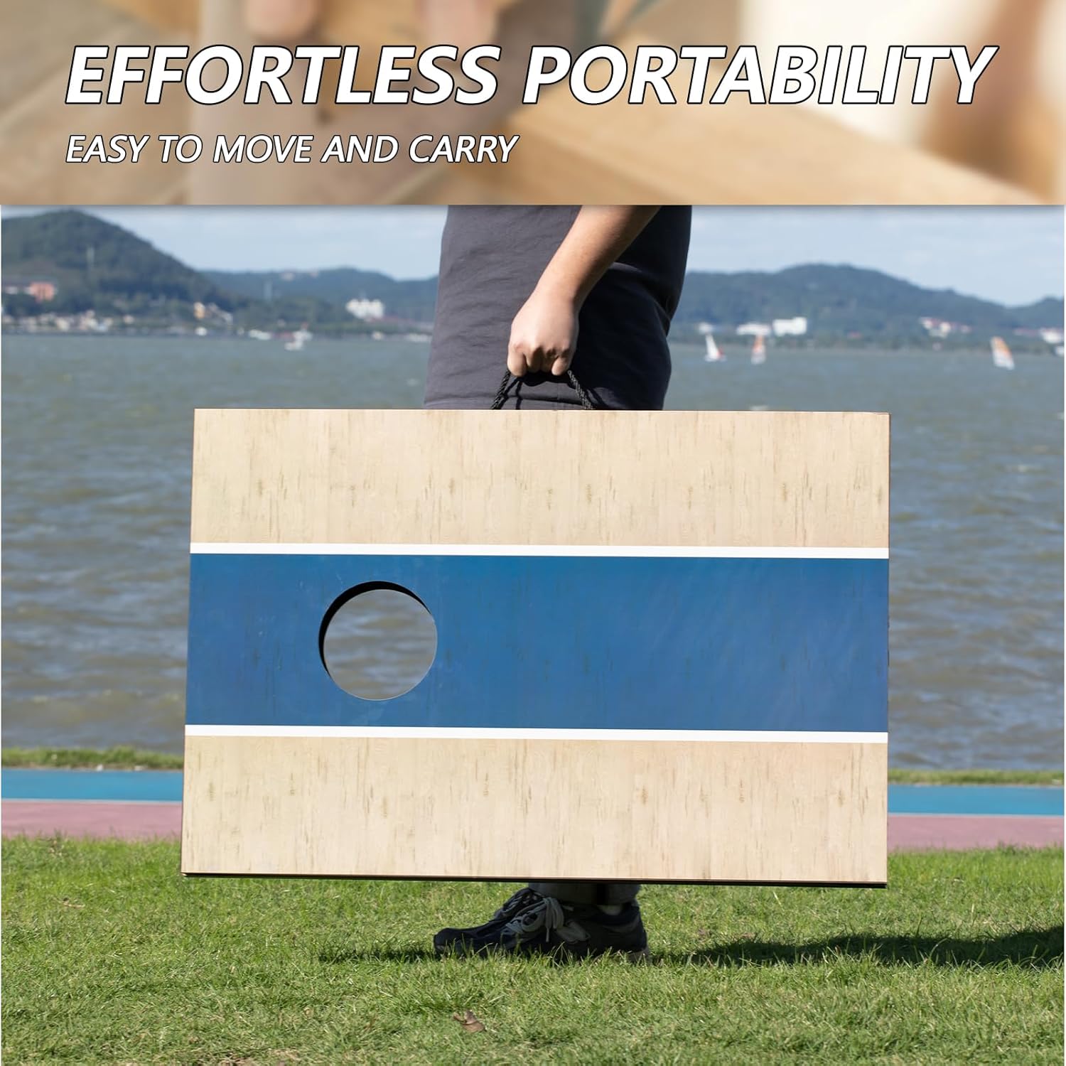 - EASY CARRYING:Each corner of the cornhole board is with velcro, so it’s quite easy to put two piece boards together for convenient storage and transportation.Nature hemp rope handles with each board, easy to carry. The cornhole game set is ready to play when take it out of the box.