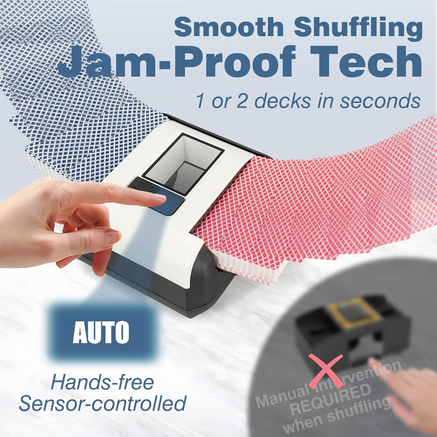 - [Jam-Proof Technology] -Advanced anti-jam mechanism ensures smooth shuffling of 1-2 decks in seconds, with no interruptions—so you can focus on playing, not fixing the shuffler