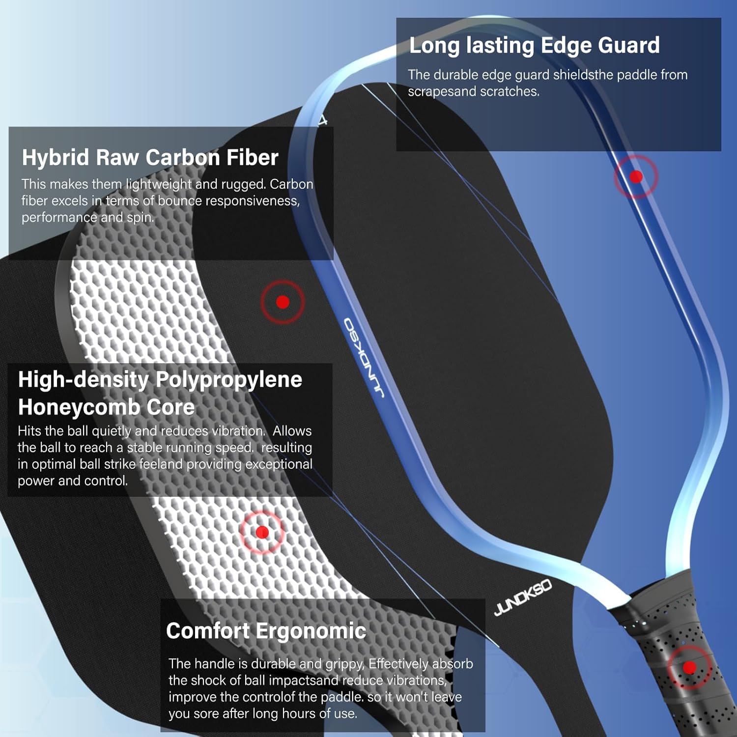 - After-Sales Service: JUNDKSO every pickleball paddle is backed by superior quality and under strict quality inspection. Our pickleball paddle are one of the best choices for men's and women's training. If there are any quality issues, our professional after-sales team is here to assist you.